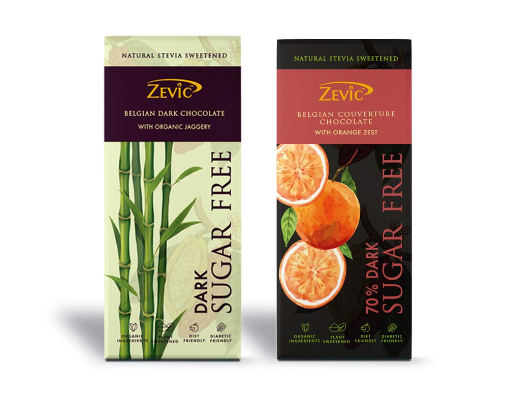 Zevic Chocolate with Organic Jaggery and 70% Dark Belgian Chocolate with Orange Zest and Stevia 40 gm - Pack of 2