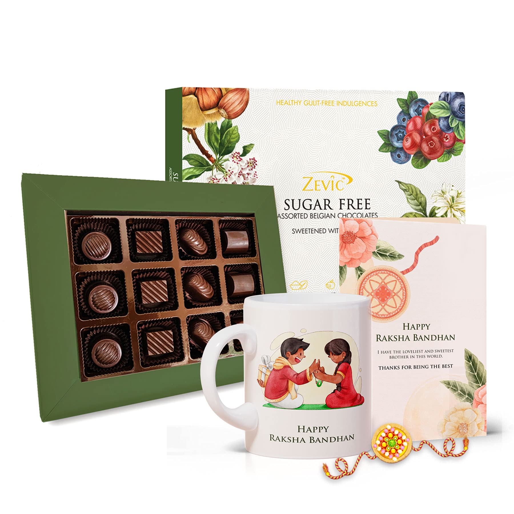 Every single creation of Rakhi Special Zevic Rocher collection is handcrafted by an expert chocolatier using the finest organically sourced Belgian Cocoa imbued with the sweetness of Stevia. This scrumptious indulgence along with our candid notes assuredly makes your desire reach its pinnacle as it melts effortlessly in your mouth ushering a sense of ecstasy and bliss for the guilt-free experience. This pack consists of a Rakhi Rakhi special mug and a card!