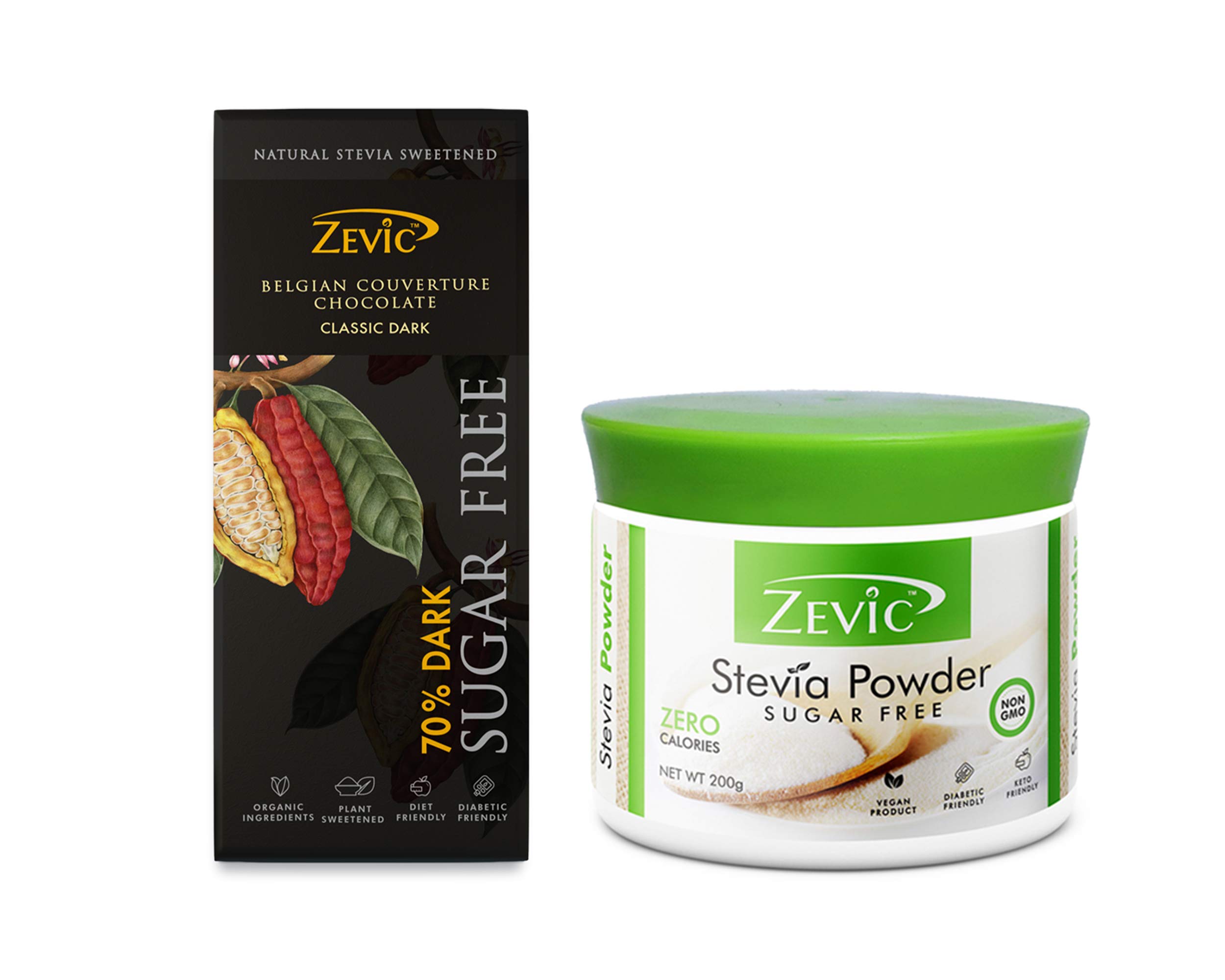 Zevic Stevia Powder has a perfect sweetness to sweeten your food & beverages taste with no after taste. Indulge in our absolutely guilt free divinity of 70% rich cocoa made with select handpicked cocoa beans mildly enrobed with Naturally Zero Calorie sweetness of Stevia plant to give you the most luscious chocolate experience that'll leave your taste buds craving for more we promise! We do not add sugar or artificial sweeteners.