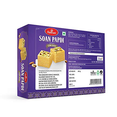 Haldi ram cow ghee so an papdi a flaky sweet made with sugar gram pulse flour and dry fruits. No artificial colours and preservatives.