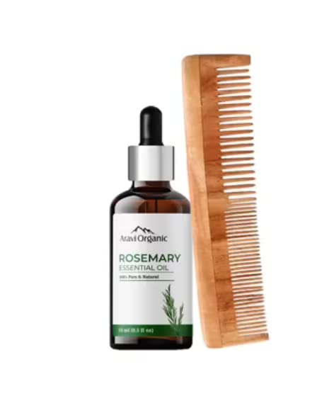 Aravi Organic Rosemary Essential Oil 15ml & Neem Wood Comb Combo (Pack of 2)