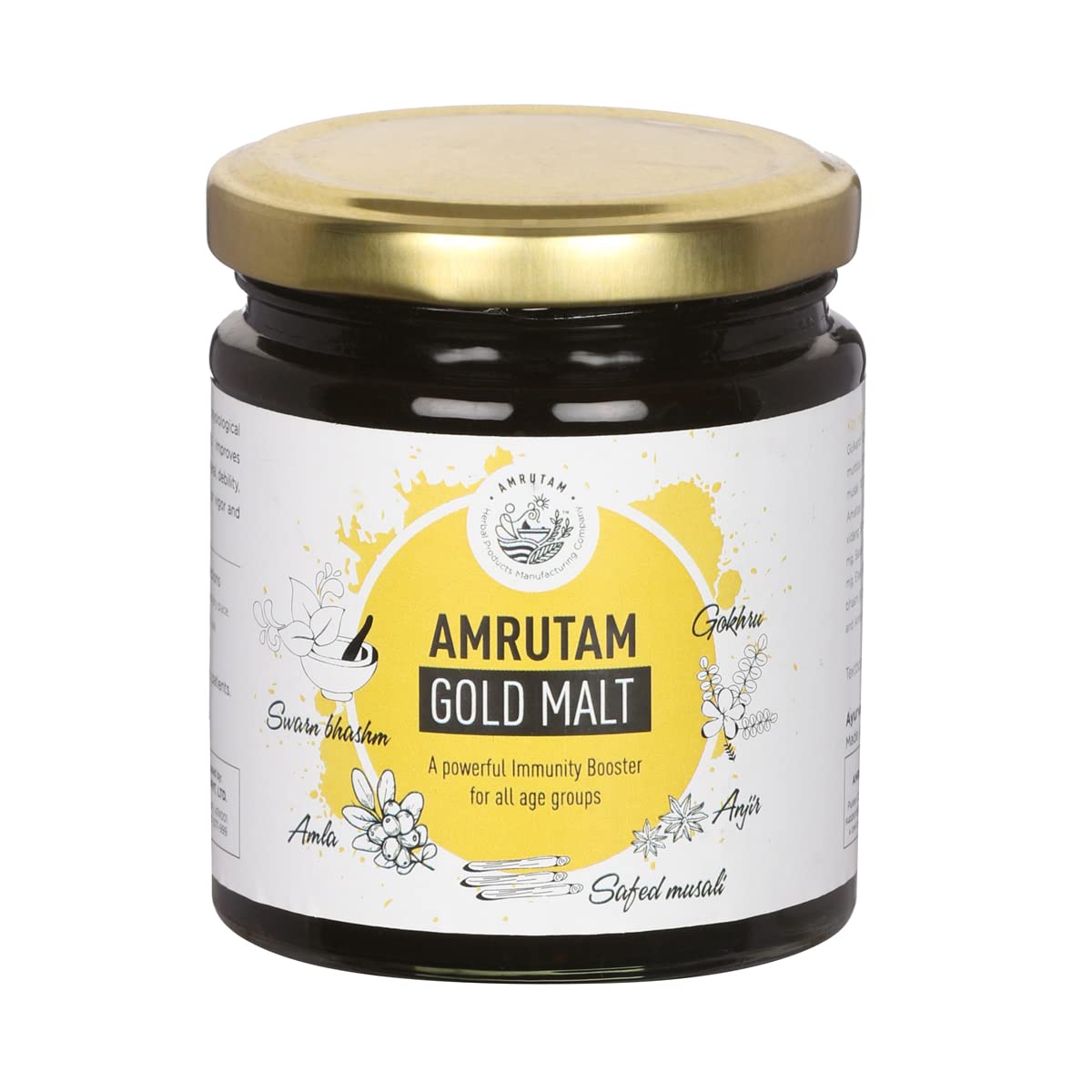 HomeHealth & PersonalDiet & NutritionChyawanprashAMRUTAM Gold Malt Powerful Immunity Booster for All Ages | Helps in Body Strength | Improves Appetite | Helps in Weight Loss | Immune System Enhancer | Ayurvedic Health Supplement | Goodness of Ashwagandha Gulkand Kismis Anjeer and Safed Museli 200g