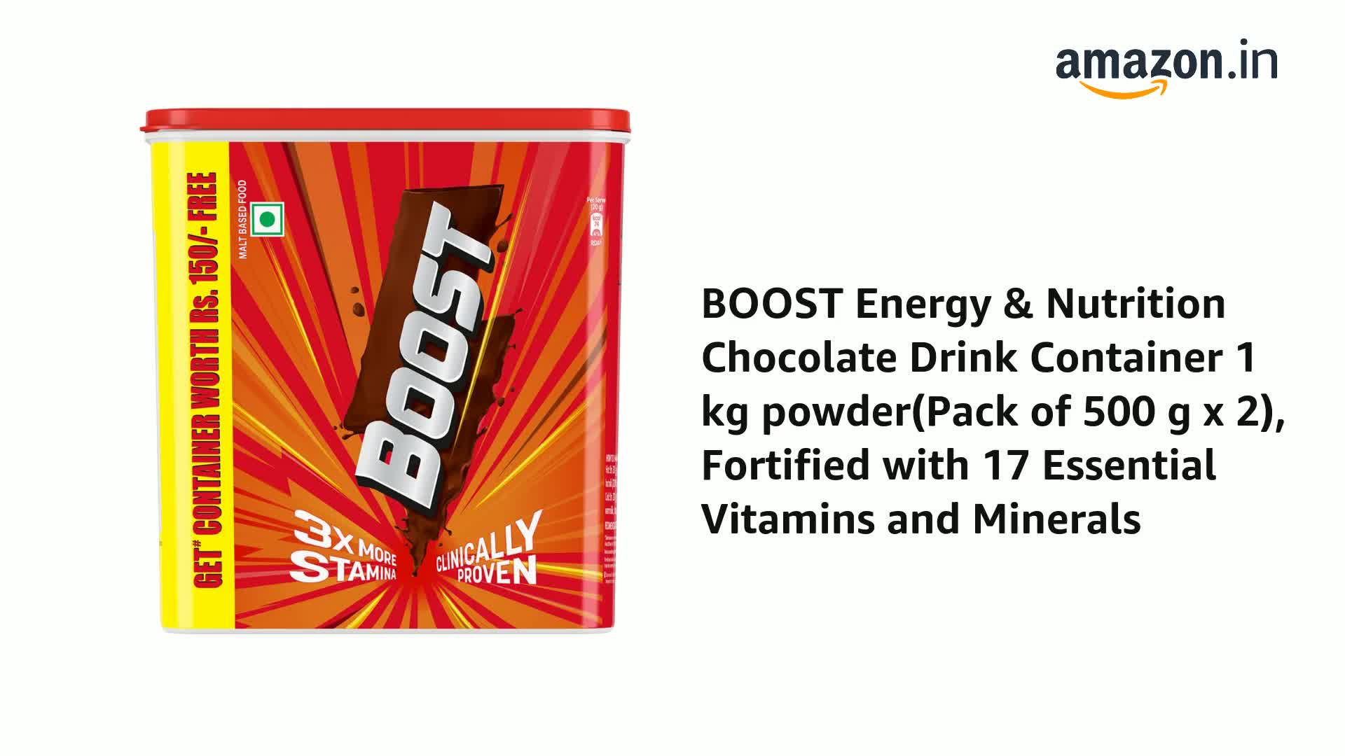 Boost is one of India's leading Malt-based foods fortified with a combination of micro-nutrients that are known to be essential for oxygen utilization of the body and energy metabolism. Boost is clinically proven to increase stamina by 3 times (3X) more. Enjoyed by some of your favourite cricket superstars all over India delicious chocolate Boost drink can be prepared with hot or cold milk and is fortified with 17 essential vitamins and minerals. Boost is proven to be a Nourishing beverage that helps build stamina Boost Has nutrients which help in maintenance of optimal bone & muscle strength. Boost is Enriched with Envita Nutrients (Iron Vitamin A C Folic Acid B12 and B6). Envita nutrients help transport oxygen more effectively in the body. Nutrients present in boost nourish the body in multiple ways- Iron and Vitamin C- help in effective transportation of oxygen to muscle. Vitamin B12 Vitamin B2 Vitamin B6 Folic Acid- In the presence of oxygen muscles produce more energy. Boost has nutrients which help in optimal utilization of oxygen. Vitamin D Calcium and protein- Nutrients which help in maintenance of optimal bone & muscle strength for strength. Vitamin B1 Niacin Biotin Pantothenic Acid Iodine Magnesium- Energy releasing nutrients which help release energy from food.