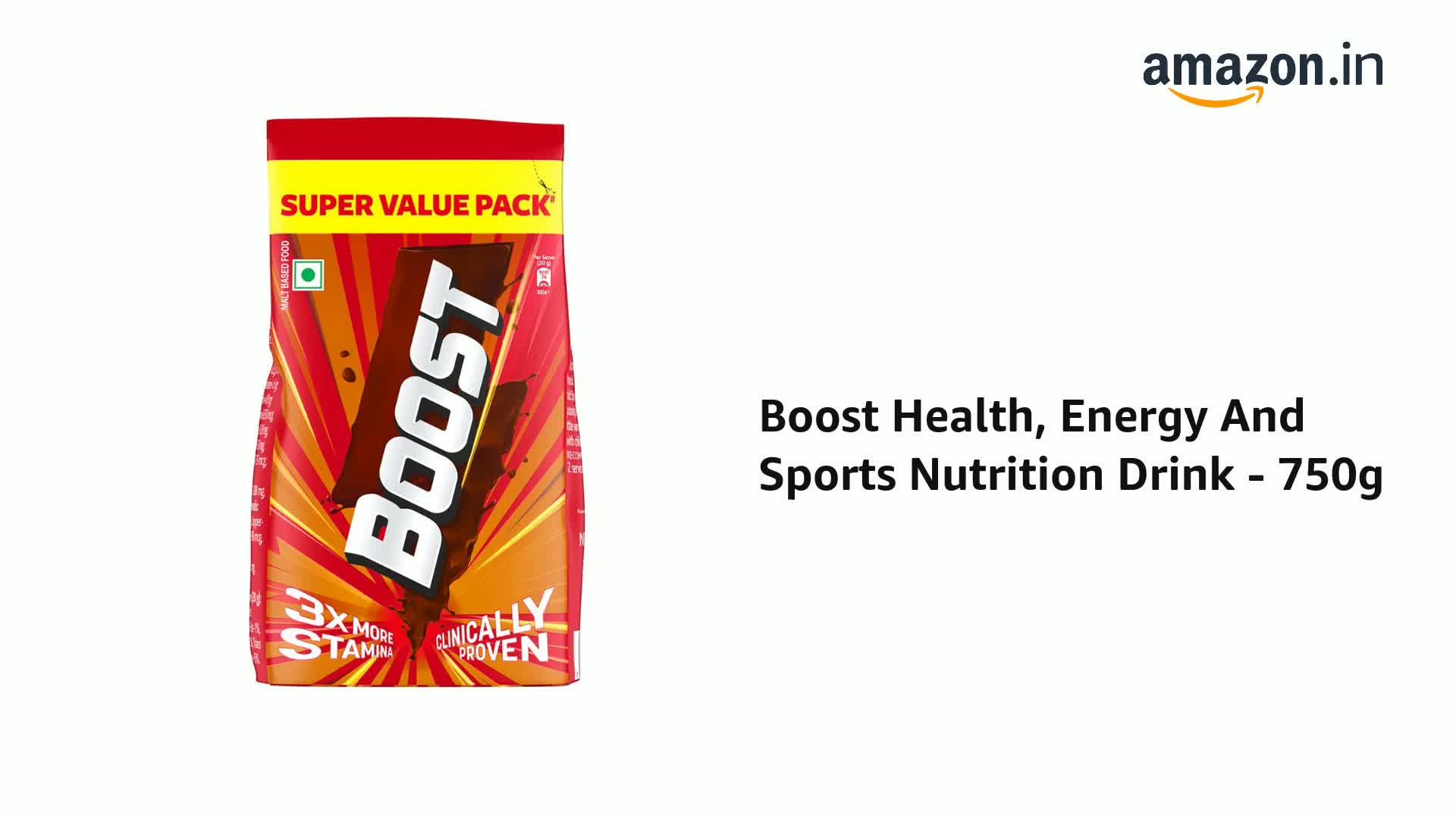 Delicious chocolate Boost is a kid's nutrition drink can be prepared with hot or cold milk. It is fortified with 17 essential vitamins and minerals. Boost is proven to be a nourishing drink that helps build stamina.How does Boost help improve stamina and bone strength?Boost is one of India's leading Malt-based foods fortified with a combination of micro-nutrients that are known to be essential for oxygen utilization of the body and energy metabolism. Boost is clinically proven to increase stamina by 3 times (3X) more. This health mix powder has nutrients which help in maintenance of optimal bone & muscle strength and is enriched with Envita Nutrients (Iron Vitamin A C Folic Acid B12 and B6). These Envita nutrients in Boost help transport oxygen more effectively in the body.What type of vitamins and minerals does the children's health drink Boost have?Nutrients present in Boost nourish the body in multiple ways - Iron and Vitamin C help in effective transportation of oxygen to muscle. It is also packed with Vitamin B12 Vitamin B2 Vitamin B6 Folic Acid. In the presence of oxygen muscles produce more energy. Boost has nutrients which help in optimal utilization of oxygen. Vitamin D Calcium and protein are nutrients which help in maintenance of optimal bone & muscle strength for strength. Vitamin B1 Niacin Biotin Pantothenic Acid Iodine Magnesium are energy releasing nutrients which help release energy from food.
