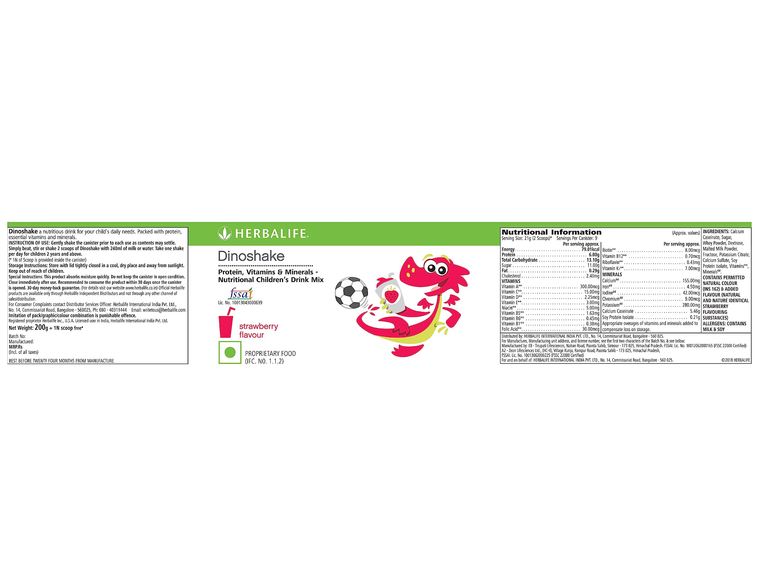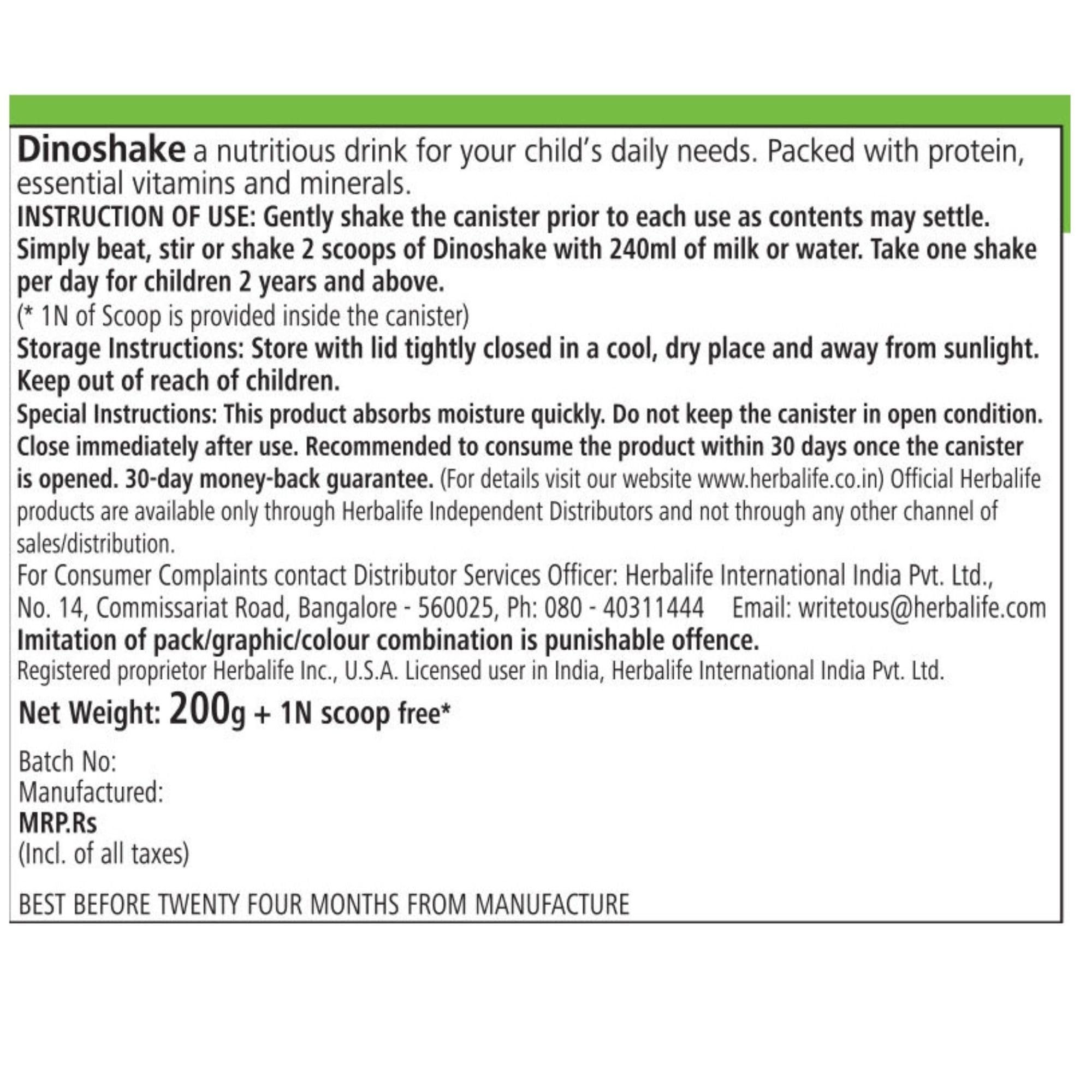 Dinoshake is a delicious and nutritious shake crafted especially for the little ones in your family. Designed with children's unique nutritional needs in mind Dinoshake provides a tasty and convenient way to help support your child's daily nutritional needs for growth and development. Dinoshake is packed with essential vitamins minerals and nutrients. This proprietary formula is specially developed with a blend of whey casein and soy proteins. Dinoshake is also packed with essential micronutrients like calcium and antioxidant vitamins A C and E. Designed for ultimate convenience and available in two lip-smacking flavours Dinoshake is guaranteed to become your child's favourite treat. Gently shake the canister prior to each use as contents may settle. Simply blend stir or shake 2 scoops of Dinoshake with 240 ml of milk or water. Take one shake per day for children 2 years and above.* Store with the lid tightly closed in a cool dry place away from sunlight. Keep out of reach of children. Recommended to consume the product within 30 days once the canister is opened.