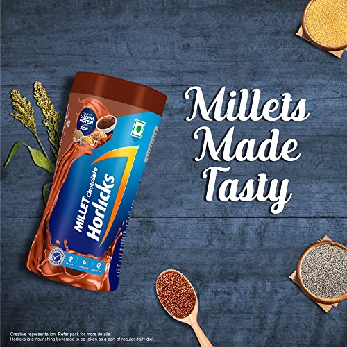 Millet chocolate Horlicks is designed to address this very challenge of nutrition not being tasty and resolve the tension around nutrition between mother and the child. Millet chocolate Horlicks is made with the traditional wisdom of millets that each millet has its own importance e.g.: finger millets are full of calcium sorghum has Potassium and phosphorus and foxtail is fibrous and thus you need a mix of millets and not just one. That is why millet chocolate Horlicks is made with the goodness of multi millets like: ¢Pearl millet ¢Finger millet ¢Foxtail millet and ¢Sorghum. This cocktail of multi millets is hidden in the yummy taste of chocolate. making the kids absolutely love the taste and finish their glass of millets without any fuss. Millet chocolate Horlicks is a health food drink that can be consumed either with milk or water along with the regular diet. It doesn't need cooking; it is easy to prepare and ready to consume. It is ideal for either hot or cold consumption. When consumed with milk it not only enhances the flavor of milk but it also ensures that your child get additional nutrition of millets and have a great start to their day.
