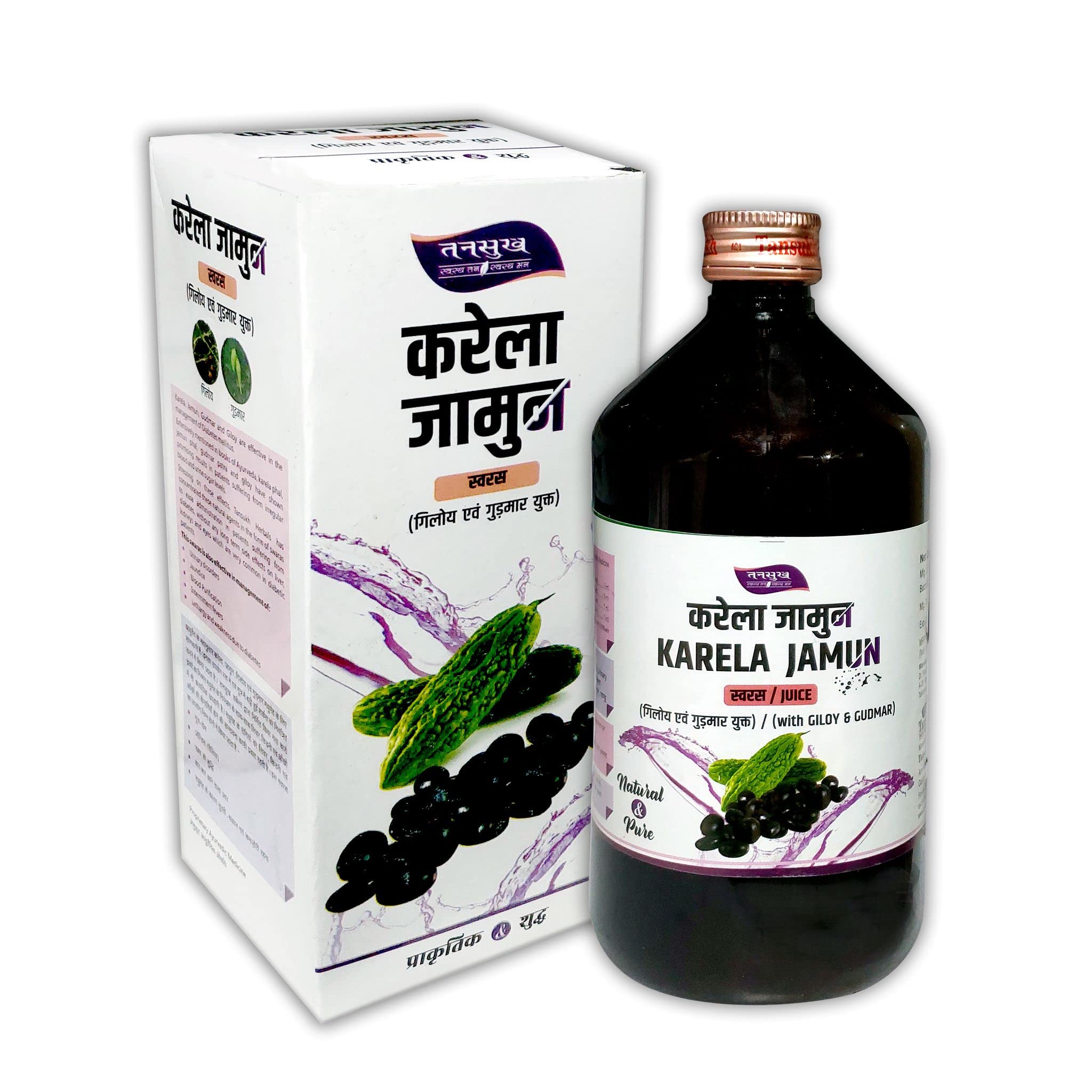 Tansukh Karela Jamun Swaras (Juice) Contains Jamun Karela along with Benefit of Giloy and Gudmar. Jamun and karela are Known Herbs as per Ayurveda that controls Blood Sugar Level.