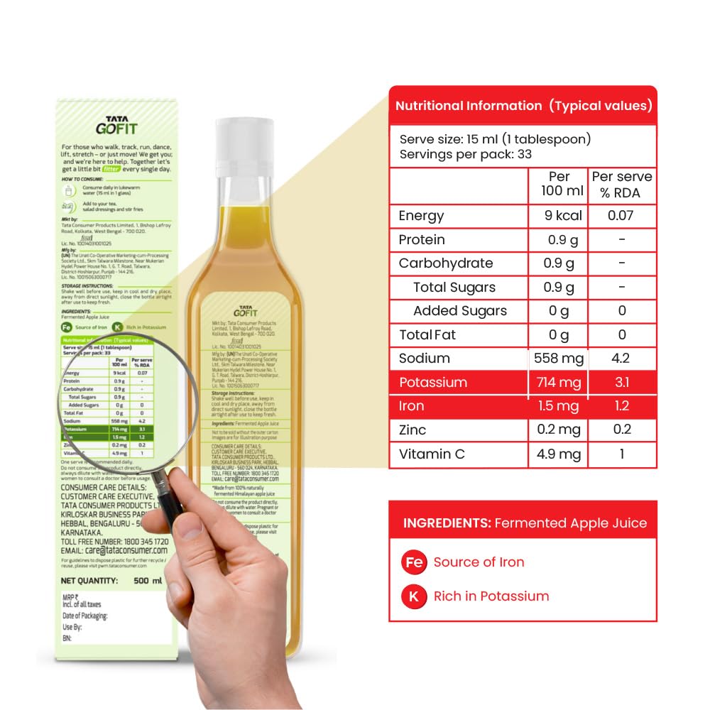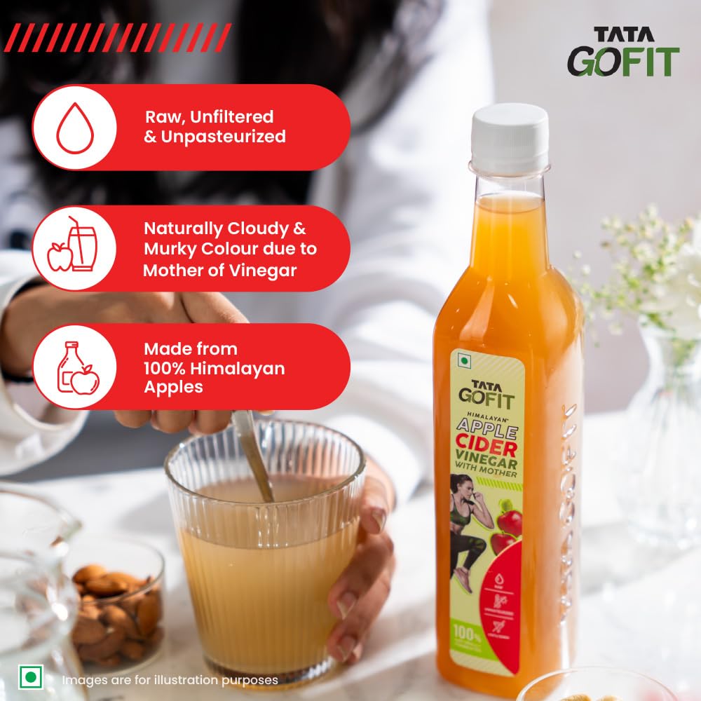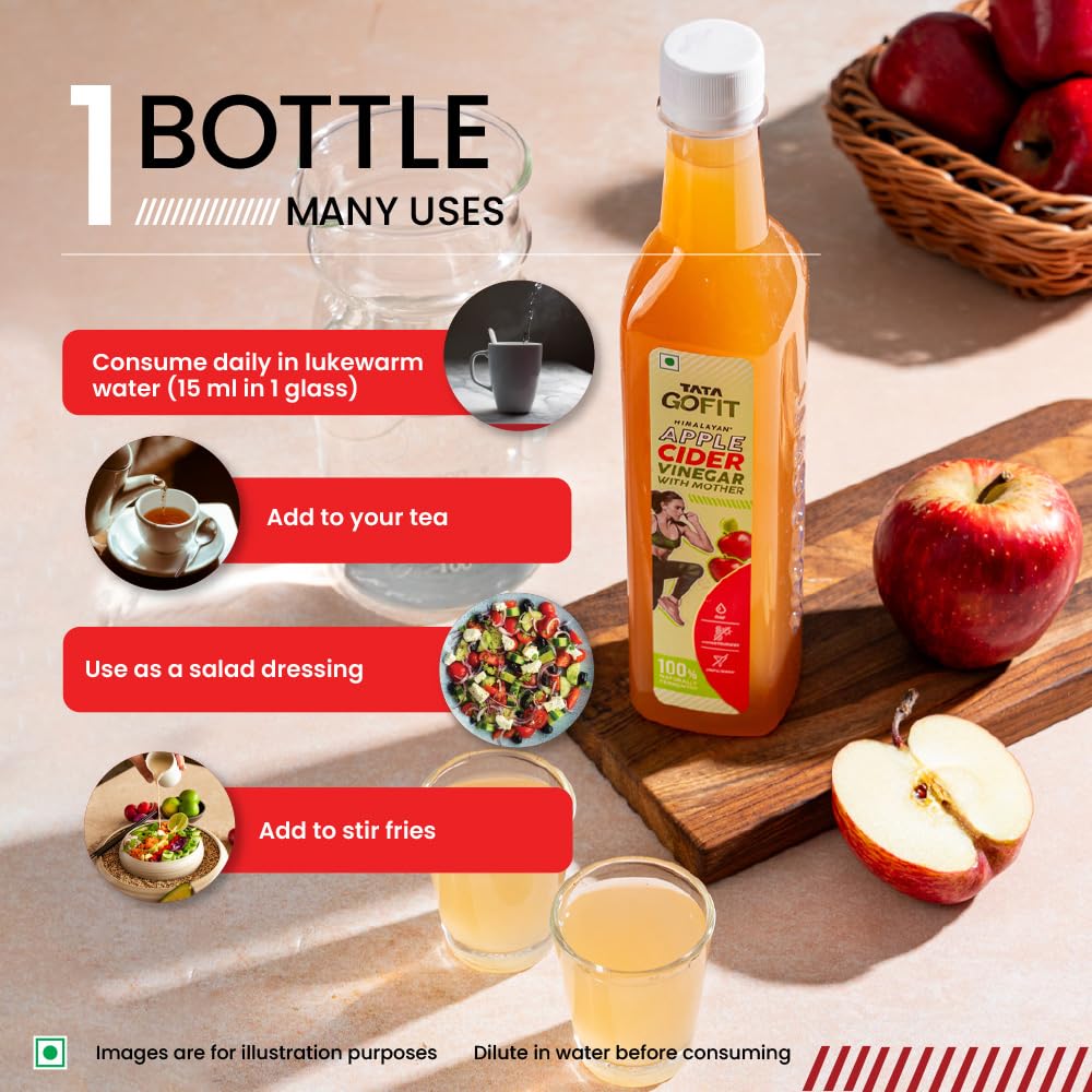 6-in-1 Benefits of Apple Cider Vinegar For those who love to walk track run dance lift stretch or just move! We get you and we're here to help. With Tata GoFit Himalayan* Apple Cider Vinegar let's get a little bit fitter every single day. Taste apple cider vinegar made from 100% naturally fermented juice of apples from the pristine hills of the Himalayas. Tata GoFit Himalayan* Apple Cider Vinegar is unfiltered unpasteurized & unrefined apple cider vinegar with genuine mother of vinegar content. Get 6 benefits of apple cider vinegar in 1; boost your immunity nourish your hair & skin improve your gut health & detox your body manage your cholesterol level and get help for your weight management journey & in fighting anaemia with Tata GoFit Himalayan* Apple Cider Vinegar and live a better quality of life. How to consume: 1. Consume daily in lukewarm water (15ml in 1 glass) 2. Add to your tea salad dressings & stir-fries 3. Rinse your hair with apple cider vinegar to remove oil build-up 4. Get glowing skin by using it as a face wash Do not consume the product directly always dilute in water. Storage Instructions: Shake well before use. Keep in a cool and dry place away from direct sunlight. Close the bottle airtight after use to keep fresh.