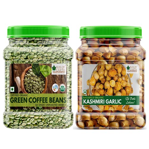 Bliss of Earth Kashmiri Lahsun or kashmiri garlic is a rare single clove varity of allium sativum. It is popolarly knows as snow mountain garlic of ek pothi lahsun in Hindi. Kashmiri garlic is an excellent source of vitamin B1 B6 C as well as copper selenium and phosphorus. It has various health benefits and can be used both raw & cooked. Direction for use: Crush & consume raw daily with water. Use in your cooking recipies. Ingredients: Kashmiri Garlic Green Coffee Beans Find yourself being drawn to a cup of piping hot coffee every morning immediately after waking up? Thatoa cause of hyperacidity folks. But we arent asking you to sacrifice your cup in lieu of better health. In fact you can guzzle coffee uninhibitedly albeit a healthier one! Healthier? Yes. A lesser known but highly health-promoting avatar of the same is ready when brewed from Green coffee beans. The unroasted seeds of the plant Coffea Arabica Green coffee beans overflow with antioxidants that battle it out with free radicals that speed up skinoageing. Now that is something which your regular coffee doesnt do for its antioxidant profile is snuffed during the process of roasting natural coffee beans something green coffee beans do not have to undergo. It cleanses our liver freeing it from toxins bad cholesterols and unnecessary fats. A healthy liver henceforth enhances our metabolism leading overall better health. Laden with fatty acids and esters including Arahidic Acid Linoleic Acid and Oleic Acid Green Coffee Beans help prevent skin sagging droopiness and wrinkle formation. All of this contributes to a younger radiant and more vibrant skin. Itotime you switch to a cleaner healthier lifestyle with Bliss of EarthoUSDA Organic Green Coffee Beans. Be guilt-free while gulping down a cuppa coffee!