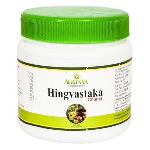 Agatsya Hingvastaka Churna is a polyherbal formulation which consists of Hingu(Asafoetida) as a major element which is a well known Indian culinary ingredient, along with combination of other significant herbs. Being a good appetizer and carminative, it helps to improve digestion and absorption of food. Hence is an effective remedy for anorexia, relieving abdominal distension and flatulence.It helps in maintaining the balance of Vata doshas.Ingredients:· Shunti· Maricha· Pippali· Ajamoda· Saindhava lavana· Shweta Jeeraka· Krishna Jeeraka· Shuddha Hingu