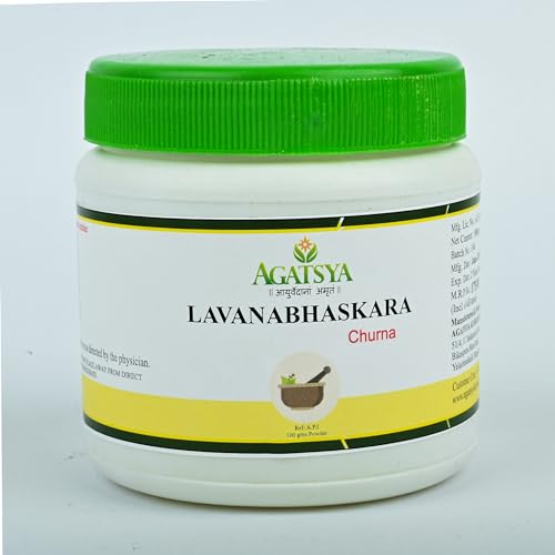 Agatsya Lavana Bhaskara Churna is a digestive aid, it is traditionally used in the treatment of abdominal bloating, gastritis, abdominal pain, indigestion, flatulence, disorders of spleen , chronic constipation, haemorrhoids and fistula . Also it is used in the management of respiratory conditions such as cough and cold. This Churna balances the vitiated Vata and Kapha doshas.