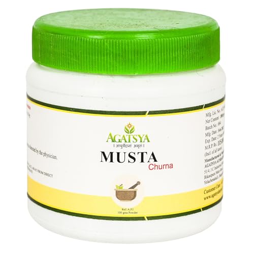 Musta is considered one of the eminent herb to promote healthy and regular menstruation. It promotes digestion, eliminates natural toxins and supports proper functioning of the liver. Its cooling and cleansing action supports healthy skin and helps to maintain normal body temperature.Botanical name: Cyperus rotundus Linn.Family: CyperaceaeUseful part: TuberRasa: Tikta, Katu, KashayaGuna: Laghu, RukshaVeerya: SheetaVipaka: KatuBalances vitiated Kapha and Pitta dosha.Agatsya Musta Churna benefits:· One of the best herb in fever management· Useful in indigestion and improves digestive strength, treats diarrhoea· Relieves worm infestation and aids quick wound healing· Subsides excessive thirst,"· Treats Cough, Asthma,"· Sthanya Vikara : Treats various breast diseases· Improves lactation· Sutika Roga : Treats post delivery disorders in women.