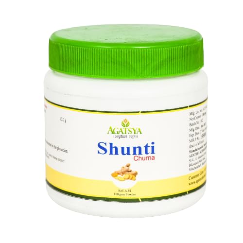 Shunti is titled as Vishvabhesaja ie the universal medicine, for its broad range of health promoting benefits. It is one of the extensively used herb in Ayurveda.Commonly known as Ginger, is a part of various cuisines. It is specifically used for digestive disorders and inflammatory conditions. It is one among the Trikatu ie group of pungent herbs.Botanical name: Zingiber officinaleFamily: ScitamineaePart used: RhizomeRasa: KatuGuna: Guru,Ruksha, TikshnaVeerya: UshnaVipaka: MadhuraPacifies Vata and Kapha doshas.Agatsya Shunti Churna benefits:· An appetizer, relieves anorexia· Cleanses and clears the tongue, improves voice· Ginger promotes healthy expectoration and eliminates excess Kapha, Useful in treating respiratory conditions like cough,cold, asthma· Traditionally used in treatment of fever, anaemia, liver disorders, piles, wounds, skin disorders· Acts as a Cardiac tonic. It supports healthy circulation, vasodilatation.· It is digestive, treats abdominal distension,colic and vomiting, relieves constipation· An aphrodisiac· Useful in inflammatory conditions like Arthritis.