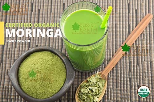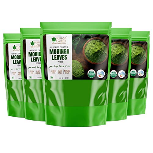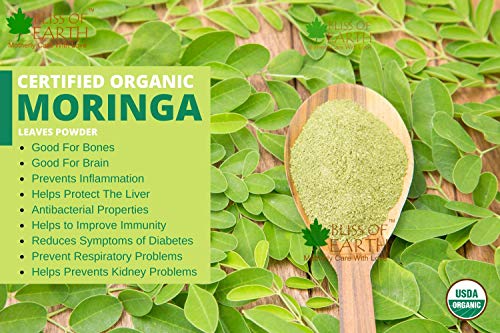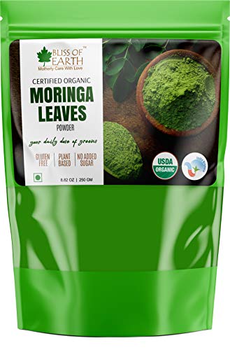 This bag of sustainably grown powder of organic moringa leaves is an excellent source of iron calcium and fiber moringa is one of the most nutrient-dense plant of the Earth. Popularly known as "tree of life" many find it beneficial for detoxification and to manage post-workout inflammation. Moringa contains 90+ nutrients and amino acids which are naturally occurring making them bioavailable as they work in unity within human body. Bliss of Earth Organic Moringa is farmed with care in India where leaves are handpicked air dried and gently milled the same day to preserve all the precious nutrients. We also preserve all of the fiber from the leaves which promotes digestion and even supports your overall gut health by acting as a probiotic. Suggested Usage: Mix 1 tbs (3 grams) in a glass of lukewarm water and and drink on empty stomach in the morning once or twice a day between meals. Enjoy mixed in water juices smoothies tea or sprinkled food.