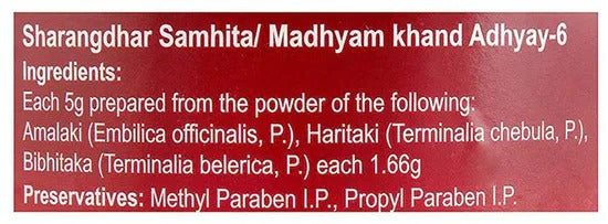 Dabur Triphala Churna: 120 GmDabur Triphala Churna is ayurvedic herbal product. It is useful for smooth functioning of bowel and relieves constipation.Ingredients :Made from rich collection of natural and herbal ingredient, this package is made from:AmlaHaradBaheraHealth Benefits :Dabur Triphala Churna has several health benefits:cleansing the stomachsmooth functioning of bowelrelieve constipationHow to Use :Take ½ to 1 of Dabur Triphala Churna teaspoonful (3 - 6g) two times in a day with lukewarm water or as suggested by the doctor.Note: The product is guaranteed to be 100% genuine. Product images are for illustrative purposes only. Images/packaging/ labels may vary from time to time due to changes made by the manufacturer's manufacturing batch and location. The product description is for information purposes only and may contain additional ingredients.Legal Disclaimer: Statements regarding dietary supplements have not been evaluated by the FDA and are not intended to diagnose, treat, cure, or prevent any disease or health condition