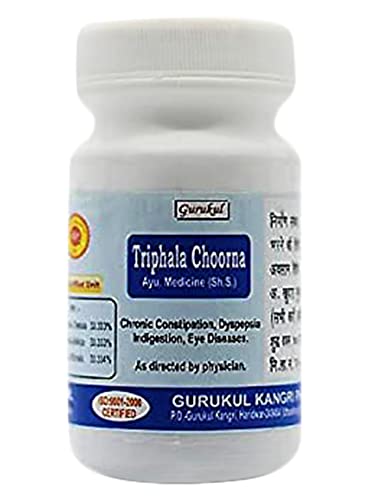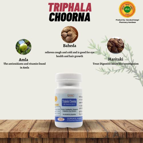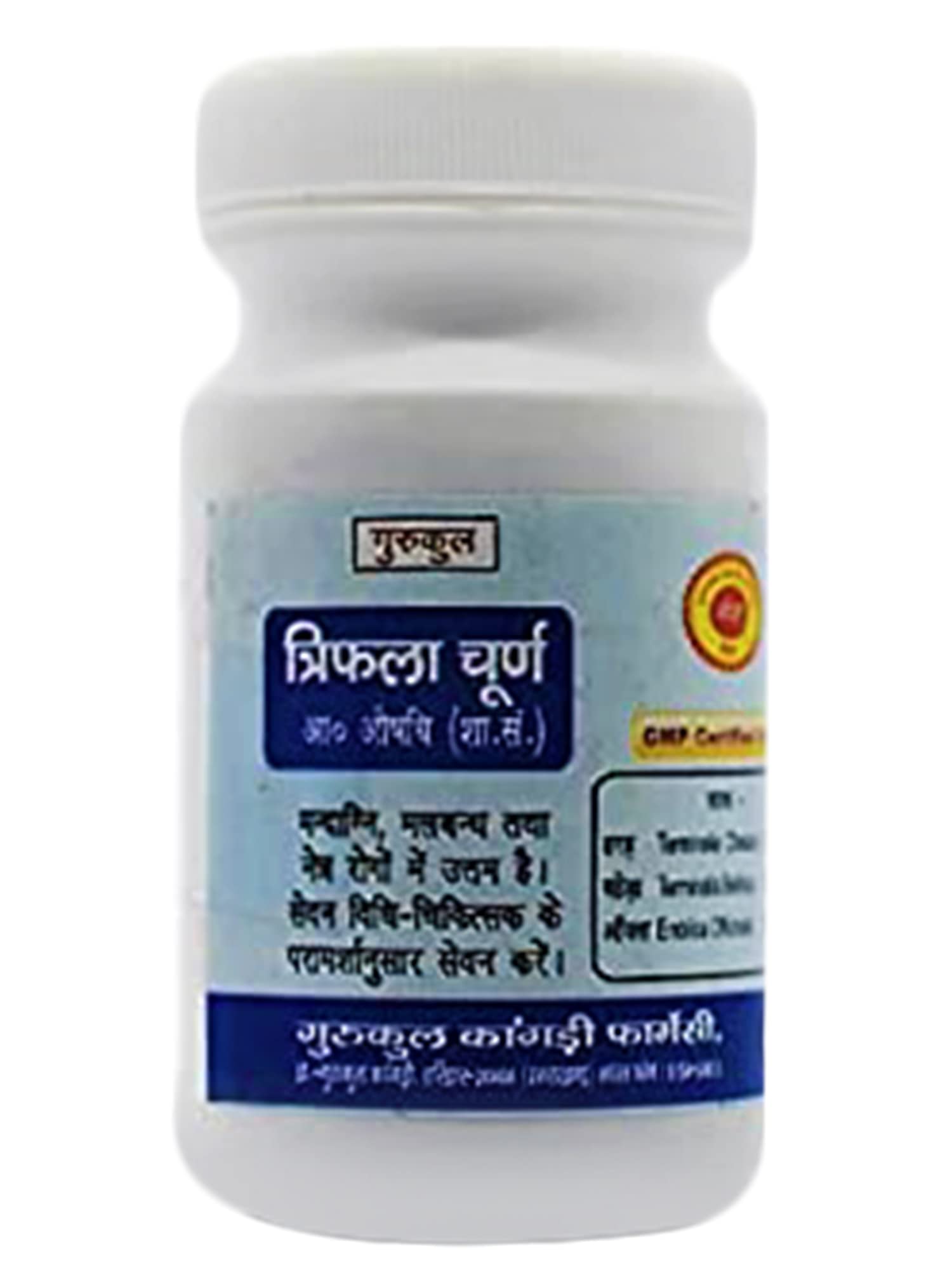 • Gurukul Triphala Choorna contains a combination of three well-known herbs Amla Harad and Bahera. These three fruits help in smooth functioning of bowel and relieve constipation.