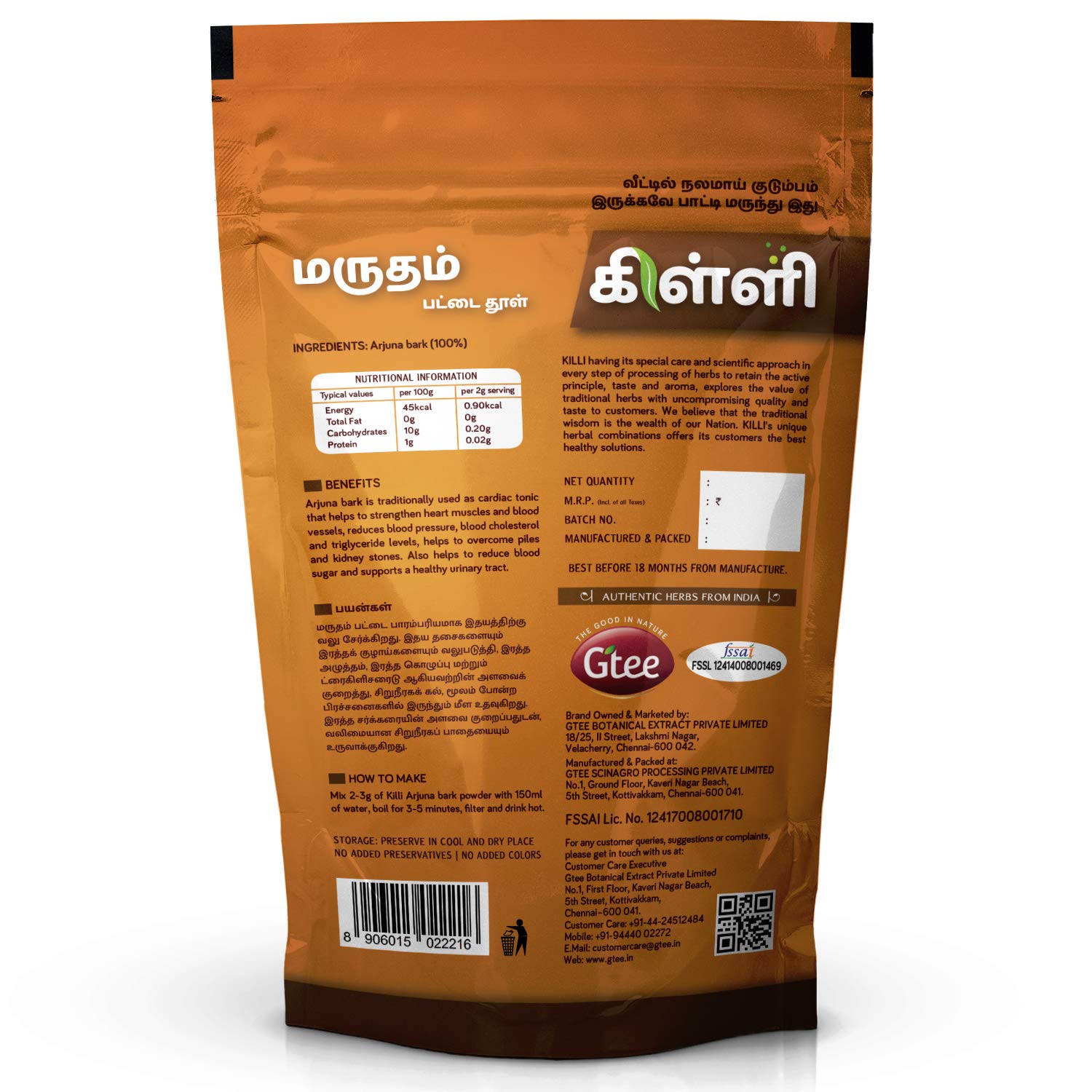KILLI ARJUNA BARK POWDERHEALTH BENEFITSArjuna Bark is traditionally used for heart health that helps to strengthen heart muscles and blood vessels reduces blood pressure blood cholesterol and triglyceride levels. Also helps to manage glucose levels and supports a healthy urinary tract.HOW TO MAKEMix 2-3g of Killi Arjuna bark powder with 150ml of water boil for 3-5 minutes filter and drink hot.KILLI HERBS & SPICESKILLI having its special care and scientific approach in every stop of processing of herbs to retain the active principle taste and aroma explores the value of traditional herbs with uncompromising quality and taste to customers. We believe that the traditional wisdom is the wealth of our Nation. KILLI's unique herbal combinations offers its customers the best healthy solutions. KILLI is a Registered Trademark of Gtee