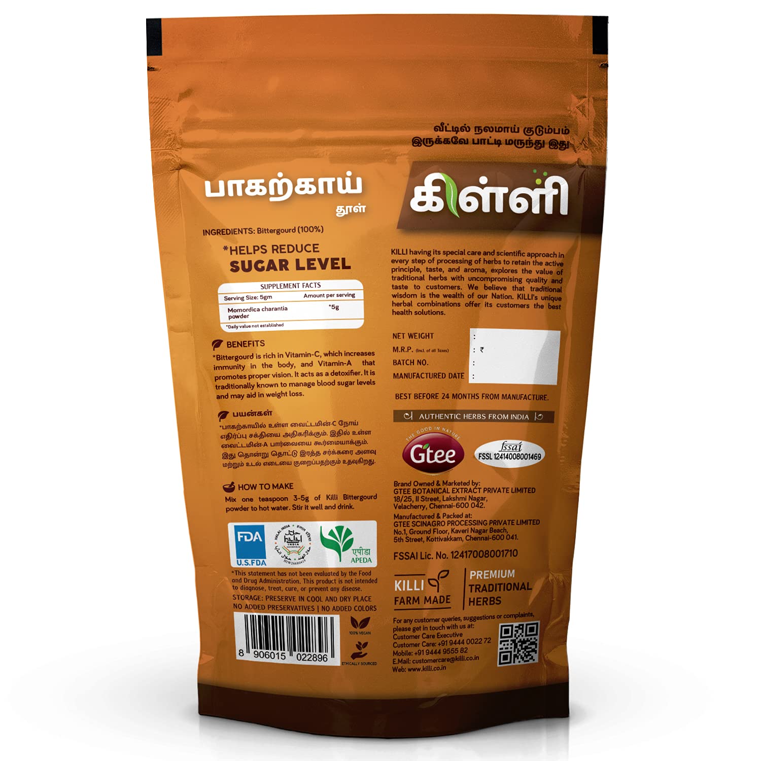 KILLI BITTER GOURD POWDERHEALTH BENEFITSBittergourd is rich in Vitamin-C and Vitamin-A.HOW TO MAKEMix one teaspoon 3-5g of Killi Bittergourd powder to hot water. Stir it well and drink.KILLI HERBS & SPICESKILLI having its special care and scientific approach in every stop of processing of herbs to retain the active principle taste and aroma explores the value of traditional herbs with uncompromising quality and taste to customers. We believe that the traditional wisdom is the wealth of our Nation. KILLI's unique herbal combinations offers its customers the best healthy solutions. KILLI is a Registered Trademark of Gtee