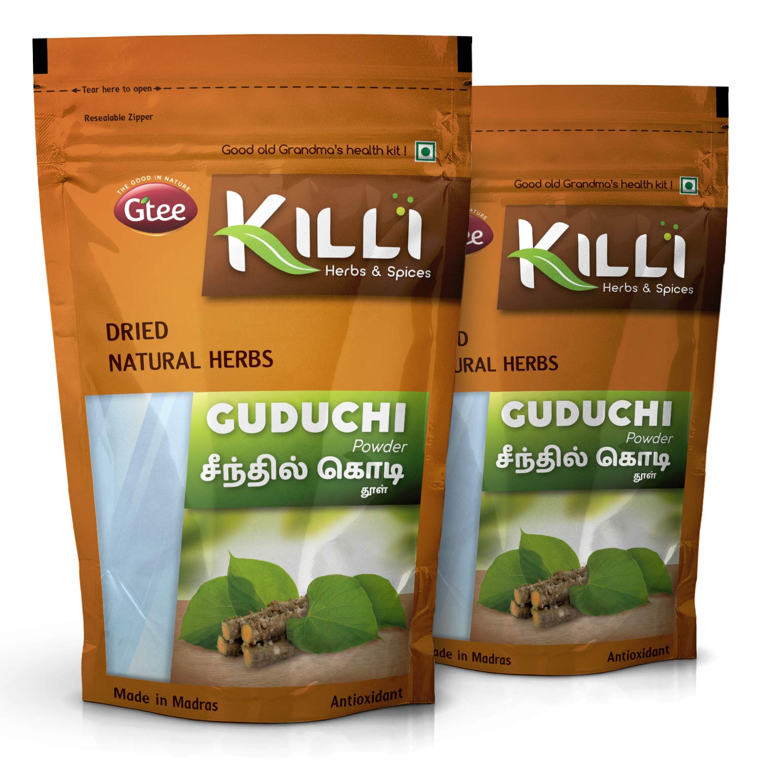 KILLI GUDUCHI POWDERHEALTH BENEFITSGuduchi has been used in Ayurveda as a protective tonic that boosts immunity and rejuvenate the body. It helps to better manage glucose level and reduces stress. It is rich in antioxidant. HOW TO MAKEMix half a teaspoon (2-3g) of Killi Guduchi powder with 150ml of hot water and serve hot. Add palm sugar to enhance the taste if required.KILLI HERBS & SPICESKILLI having its special care and scientific approach in every stop of processing of herbs to retain the active principle taste and aroma explores the value of traditional herbs with uncompromising quality and taste to customers. We believe that the traditional wisdom is the wealth of our Nation. KILLI's unique herbal combinations offers its customers the best healthy solutions. KILLI is a Registered Trademark of Gtee