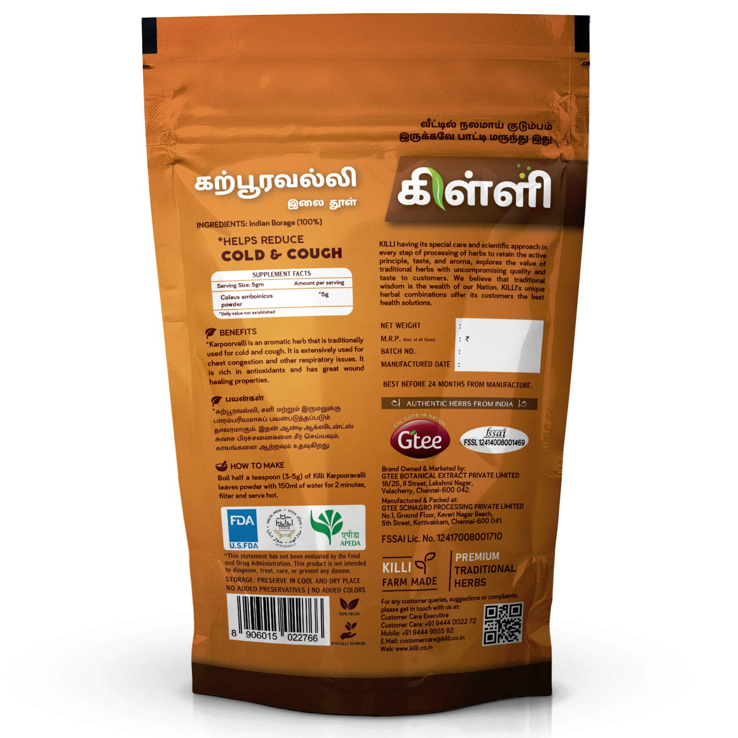 KILLI KARPOORAVALLI LEAVES POWDERHEALTH BENEFITSKarpoorvalli is an aromatic herb that is traditionally used for common cold and cough. It is rich in antioxidants.HOW TO MAKEBoil half a teaspoon (3-5g) of Killi Karpooravalli leaves powder with 150ml of water for 2 minutes filter and serve hot.KILLI HERBS & SPICESKILLI having its special care and scientific approach in every stop of processing of herbs to retain the active principle taste and aroma explores the value of traditional herbs with uncompromising quality and taste to customers. We believe that the traditional wisdom is the wealth of our Nation. KILLI's unique herbal combinations offers its customers the best healthy solutions. KILLI is a Registered Trademark of Gtee
