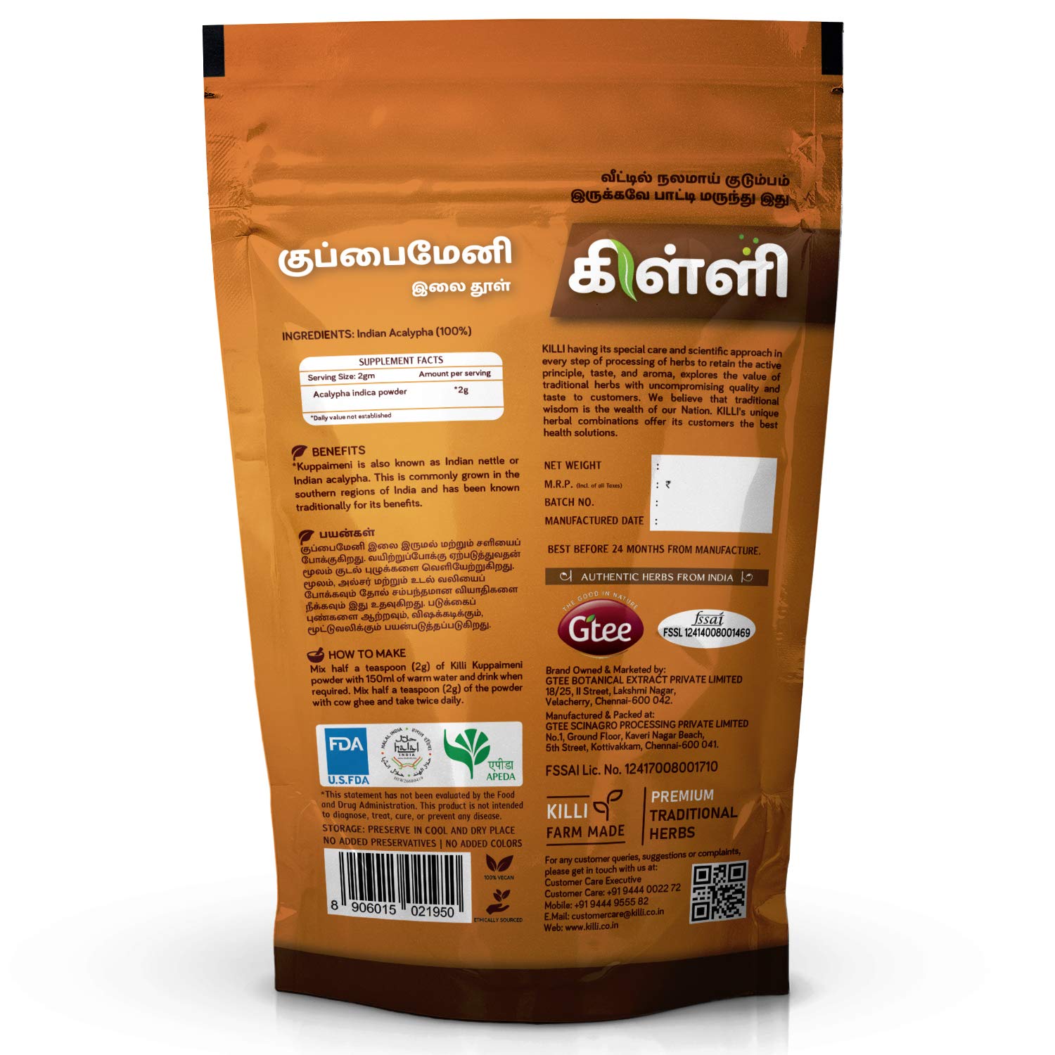 KILLI KUPPAIMENI LEAVES POWDERHEALTH BENEFITSKuppaimeni is also known as Indian nettle or Indian acalypha. This is commonly grown in the southern regions of India and has been known traditionally for its benefits.HOW TO MAKEMix half a teaspoon (2g) of Killi Kuppaimeni powder with 150ml of warm water and drink when required. Mix half a teaspoon (2g) of the powder with cow ghee and take twice daily.KILLI HERBS & SPICESKILLI having its special care and scientific approach in every stop of processing of herbs to retain the active principle taste and aroma explores the value of traditional herbs with uncompromising quality and taste to customers. We believe that the traditional wisdom is the wealth of our Nation. KILLI's unique herbal combinations offers its customers the best healthy solutions. KILLI is a Registered Trademark of Gtee