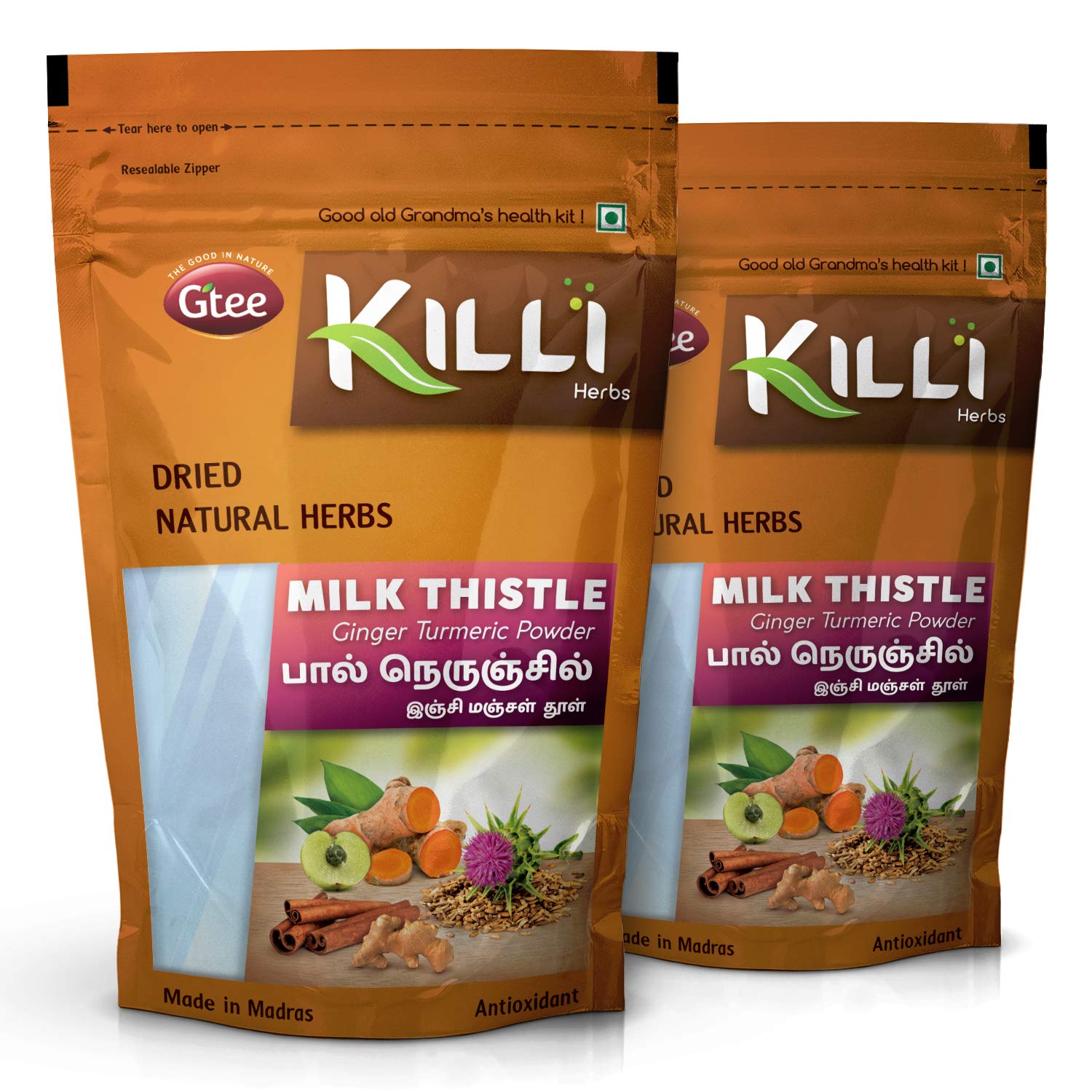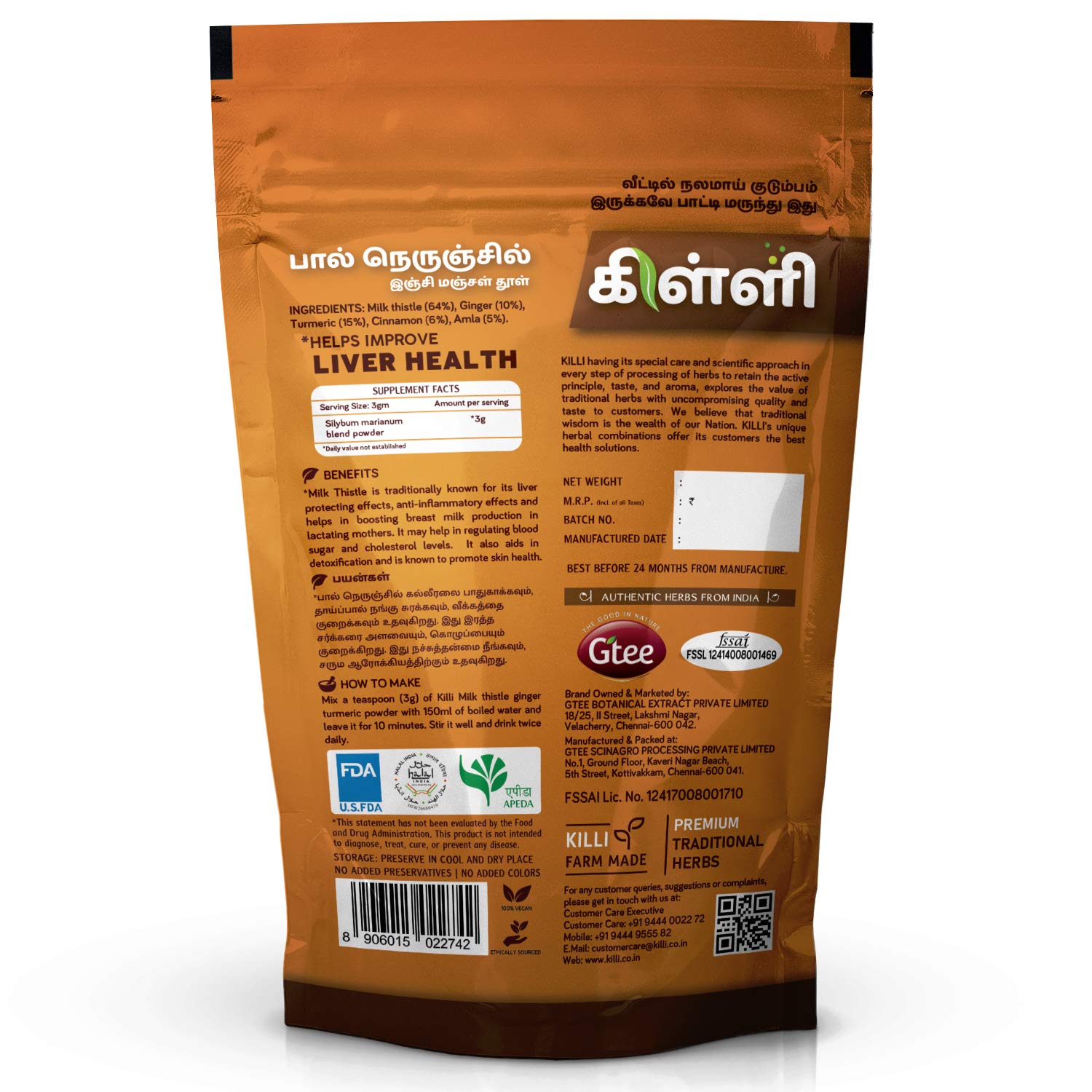 KILLI MILK THISTLE GINGER TURMERIC POWDERHEALTH BENEFITSMilk Thistle is traditionally used for its benefits. It helps in boosting breast milk production in lactating mothers. It may help to promote skin health.HOW TO MAKEMix a teaspoon (3g) of Killi Milk thistle ginger turmeric powder with 150ml of boiled water and leave it for 10 minutes. Stir it well and drink twice daily.KILLI HERBS & SPICESKILLI having its special care and scientific approach in every stop of processing of herbs to retain the active principle taste and aroma explores the value of traditional herbs with uncompromising quality and taste to customers. We believe that the traditional wisdom is the wealth of our Nation. KILLI's unique herbal combinations offers its customers the best healthy solutions. KILLI is a Registered Trademark of Gtee