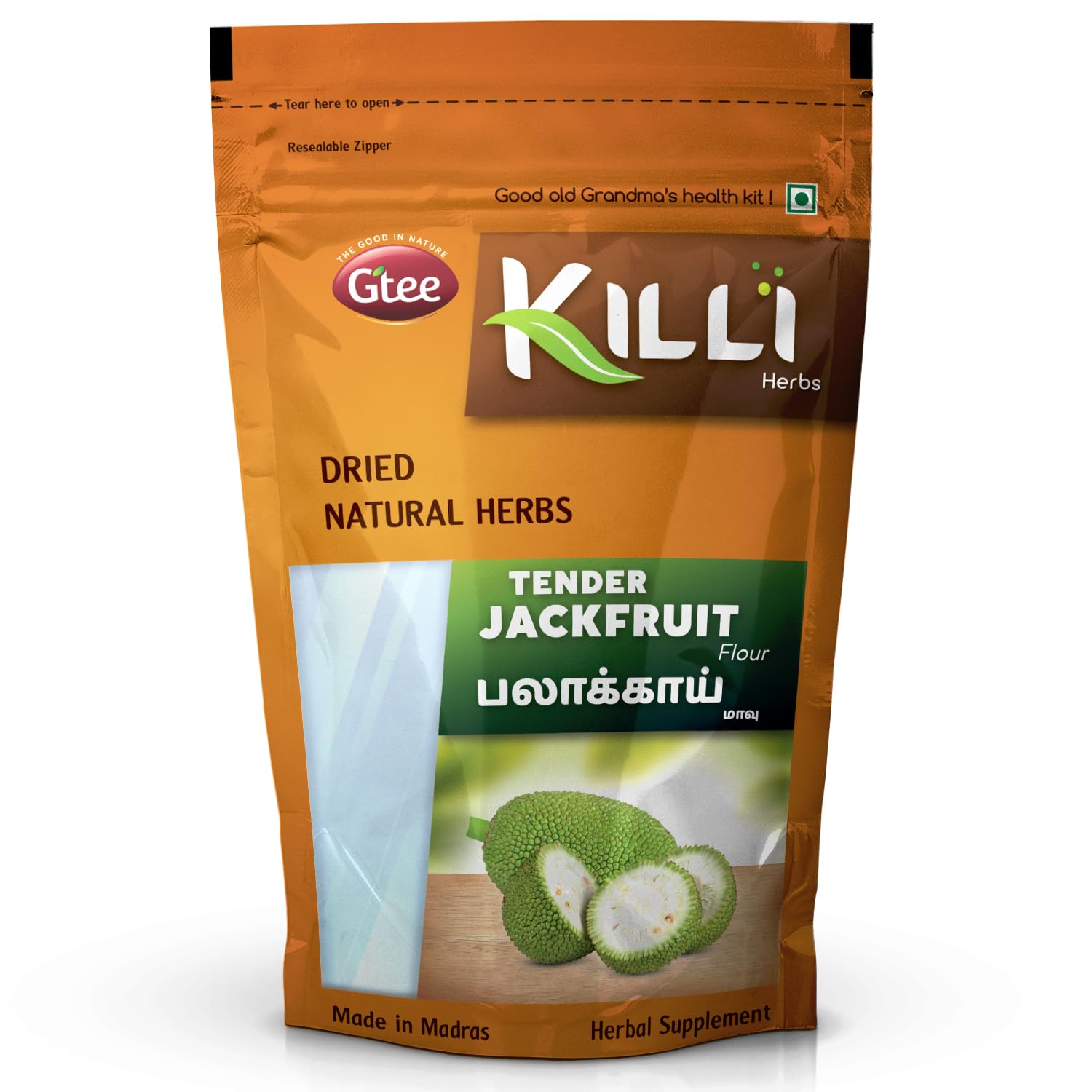 KILLI TENDER JACKFRUIT FLOURHEALTH BENEFITSTender Jackfruit is a powerhouse of nutrients high in dietary fiber aiding digestion and weight management. It is low in glycemic index supporting blood sugar control. Rich in antioxidants and vitamins it strengthens immunity and promotes heart health.HOW TO MAKEMix 3 teaspoons (12-15g) of Killi Tender Jackfruit flour with with whole wheat flour to make rotis chapathis parathas or with rice flour to make idli and dosa. KILLI HERBS & SPICESKILLI having its special care and scientific approach in every stop of processing of herbs to retain the active principle taste and aroma explores the value of traditional herbs with uncompromising quality and taste to customers. We believe that the traditional wisdom is the wealth of our Nation. KILLI's unique herbal combinations offers its customers the best healthy solutions. KILLI is a Registered Trademark of Gtee