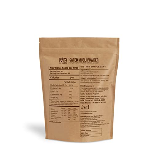 MB Herbals Safed Musli Powder 100g Chlorophytum borivilianum Rt. Safed Musli (White Musli) Roots contain 25 types of alkaloids vitamins and minerals like Calcium Potassium and Magnesium. It is a strong adaptogenic herb used in ayurveda and herbal science. Safed Musli is effective in improving male performance and provides strength to muscles. Ingredients: Chlorophytum borivilianum Root Powder - 100% No Preservatives No Additives - Free from starch yeast corn or gluten. Suitable for vegans Dosage: Adults: 500mg (1/2 teaspoon) with milk or water once or twice daily. Caution: Higher doses than 1 gram may cause stomach gas flatulence (gastric discomfort). We recommend low doses during the starting phase of safed musli supplementation. Storage: Store in a cool and dry place away from direct sunlight. Note: These statements are not evaluated by FDA and this supplement is not intended to diagnose or treat any disease. Please consult an expert before use.