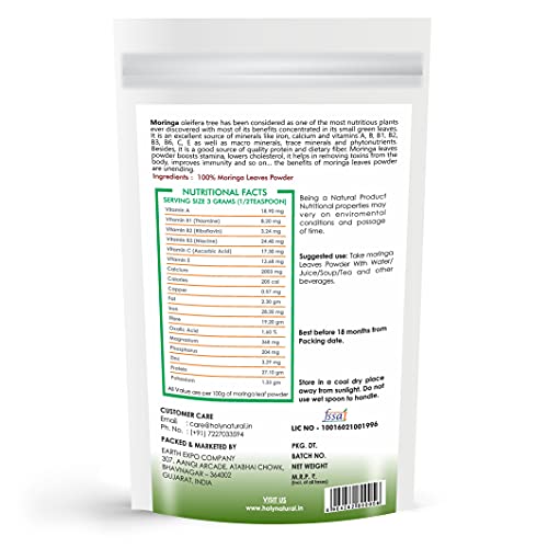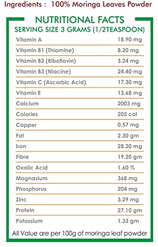 • 100 % Pure & Natural Moringa Powder. Moringa Powder is 100 % Vegan No Additive No Preservative No GMO Gluten Free Halal certified and Kosher certified.