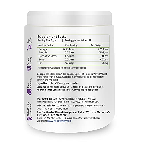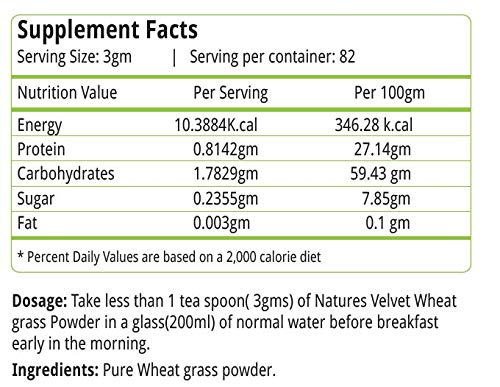 • Usage Instruction: Take less than 1 tea spoon( 3gms) of Natures Velvet Wheatgrass Powder in a glass(200ml) of normal water before breakfast early in the morning