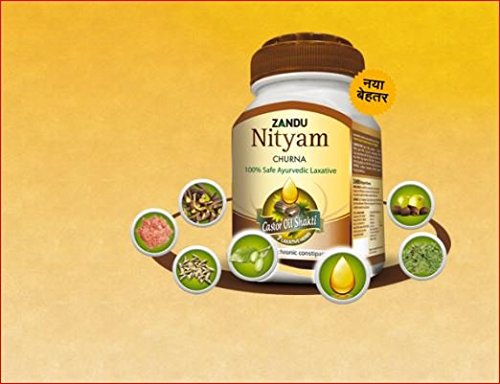 Nityam Churna an Ayurvedic laxative developed by Padmashree Vaidya Suresh Chaturvedi& panel of experts is a revolutionary formulation enriched with 7 POWERFUL LAXATIVE HERBS like castor oil triphala&saunf. It gently cleanses lubricates & moisturizes intestinal walls ensuring regular bowel movements. Composition;Each 100 gm contains: Emblicaofficinalis (Fr)- 3g Terminaliachebula (Fr)- 3g TerminaliaBelerica (Fr)- 3g GlycyrrhizaGlabra (Rt)- 5g FoeniculumVulgare (Fr)- 9g Cassia Angustifolia (Lf)- 50g Terminaliachebula (Fr)- 6g Sanchal- 18g RicinusCommunis (Ol)- 1g Bambusaarundinacia (S.C.)- QSexcipients QS Dosage; Add 1-2 teaspoonful (4-8 gm) of Zandu Nityam Churna to a glass of water. Stir gently and consume at bed time. Individual results may vary dose may be adjusted accordingly. If condition persists consult doctor. The product is not recommended during Pregnancy.