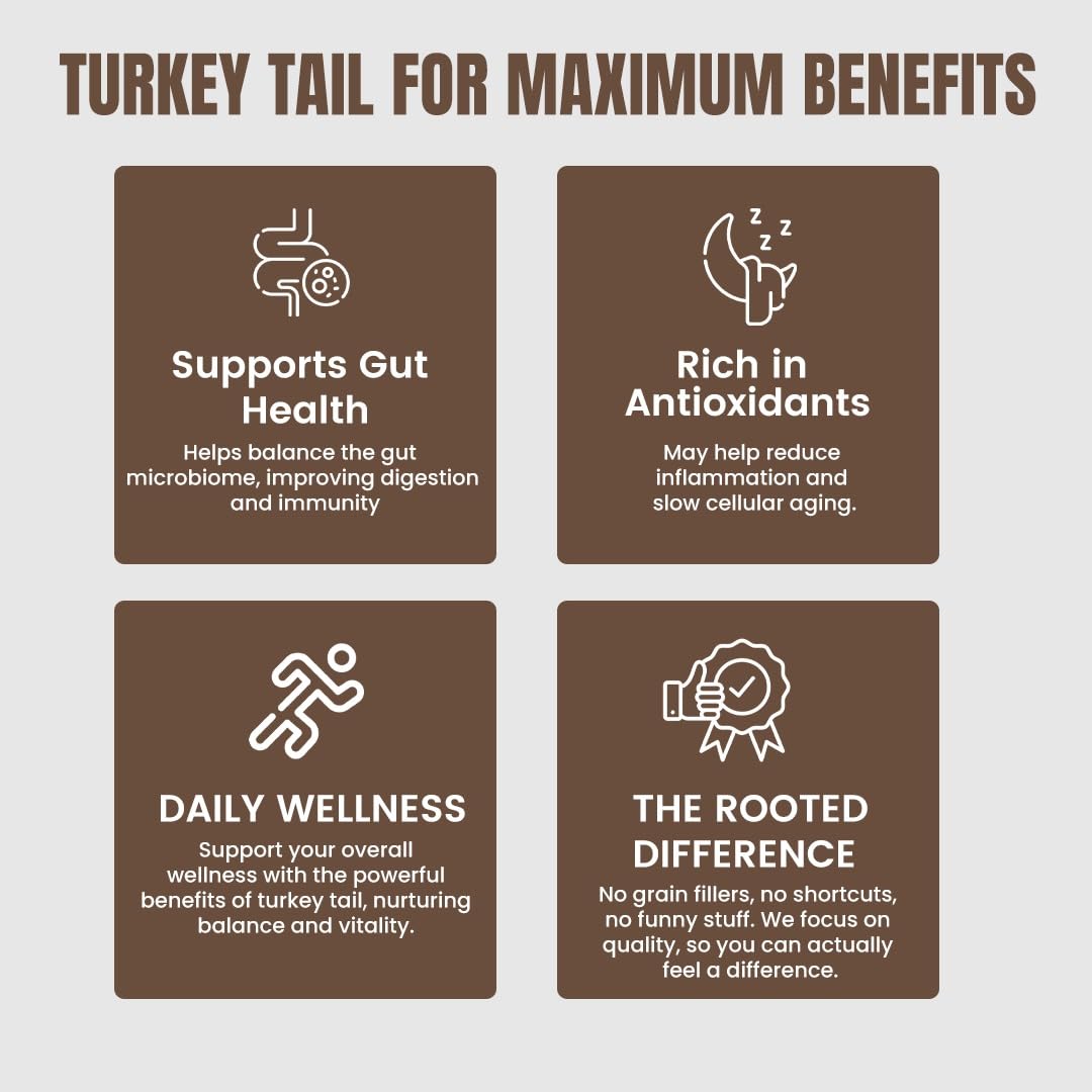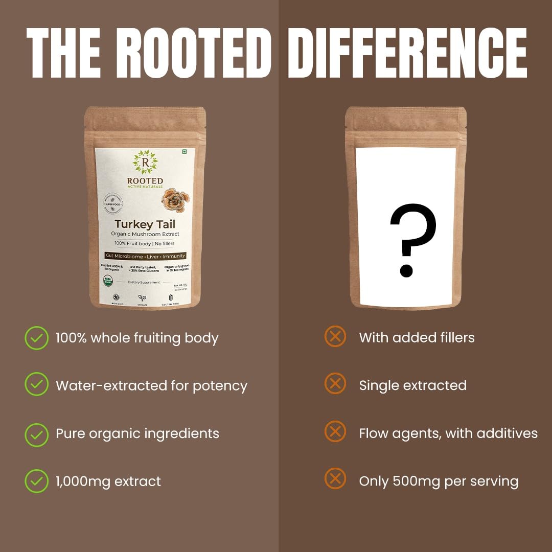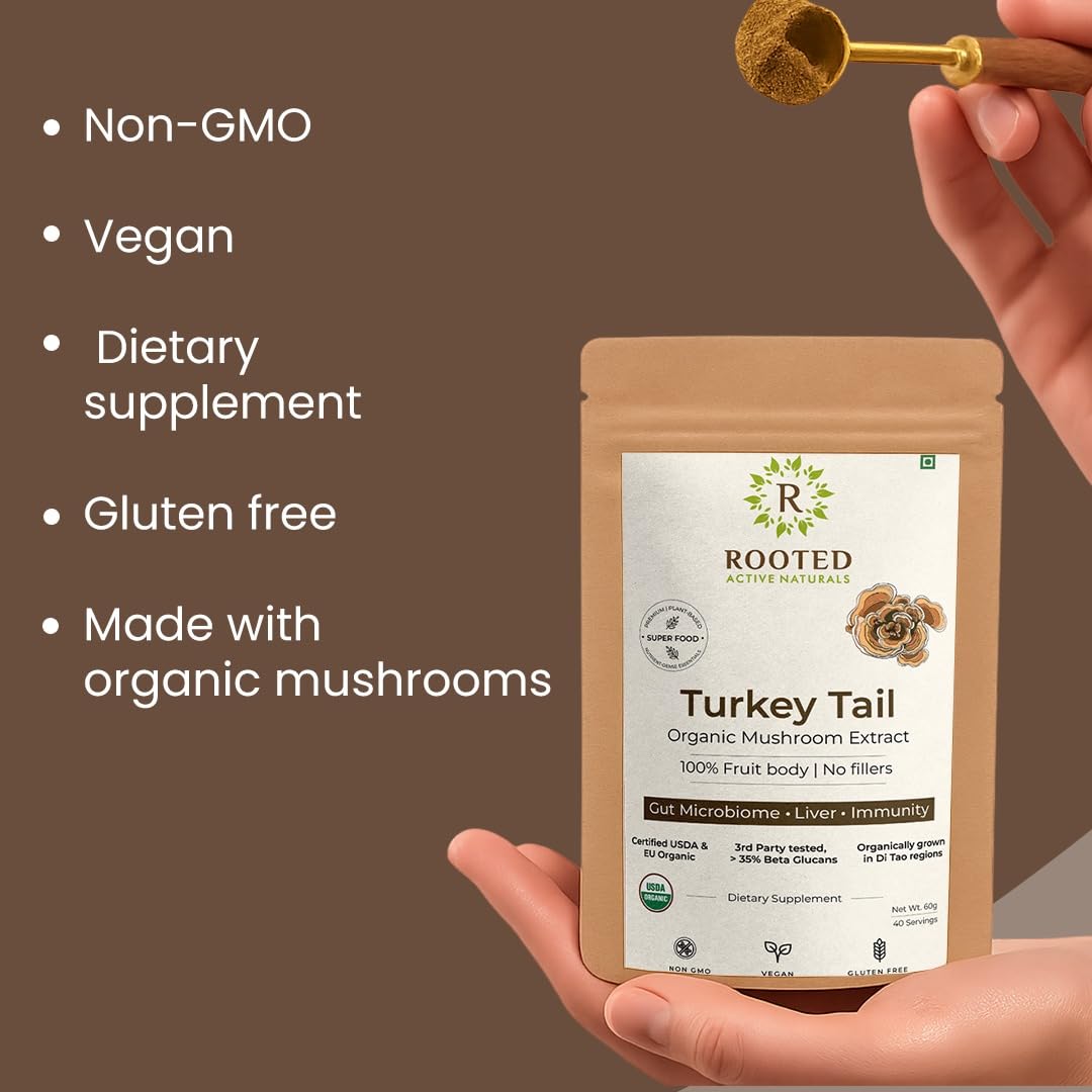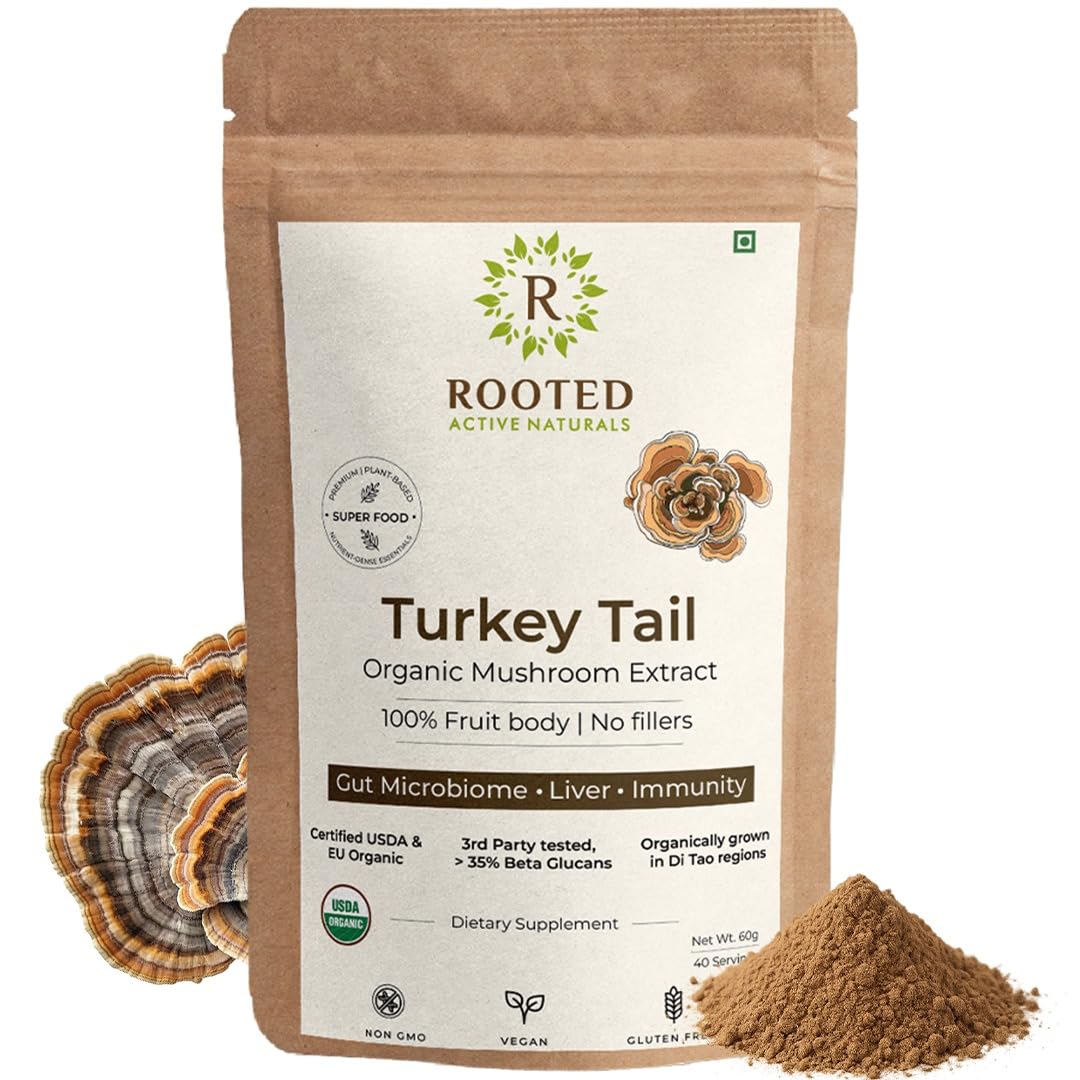 Rooted Active's Turkey Tail Organic Mushroom Powder Pouch 45 Grams 30 Servings Immune Support Ayurveda Nootropic Supplement Beta-Glucans Gut Health & Holistic Defense Mushroom Supplement