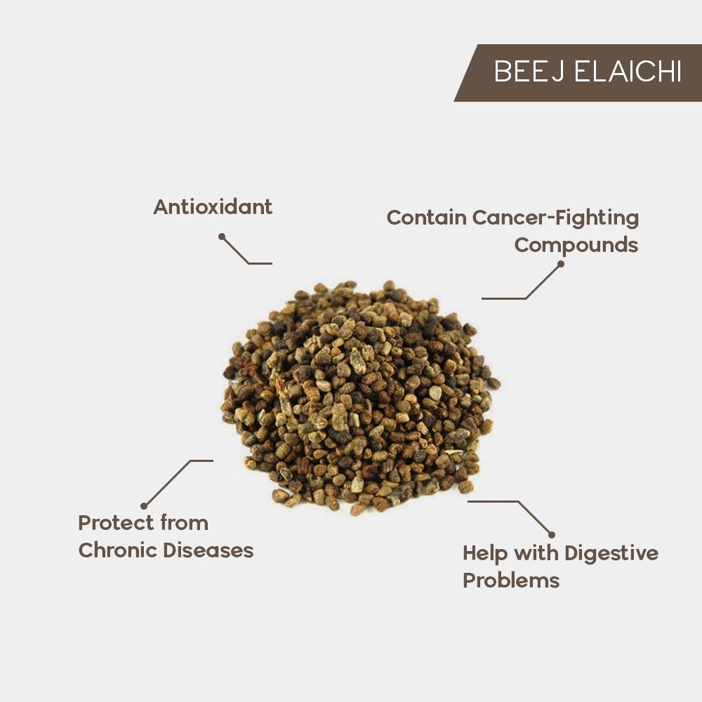 Beej Elaichi is a spice mostly used in foods. However, several eastern cultures also use cardamom in teas. This strong scent comes from the oils present in the spices seeds. The purported health benefits of cardamom come from these oils which include terpinine, borneol, eucalyptol, camphor and limonene. Elaichi is native to the evergreen forests of India. This spice is commonly used in Indian cuisine.