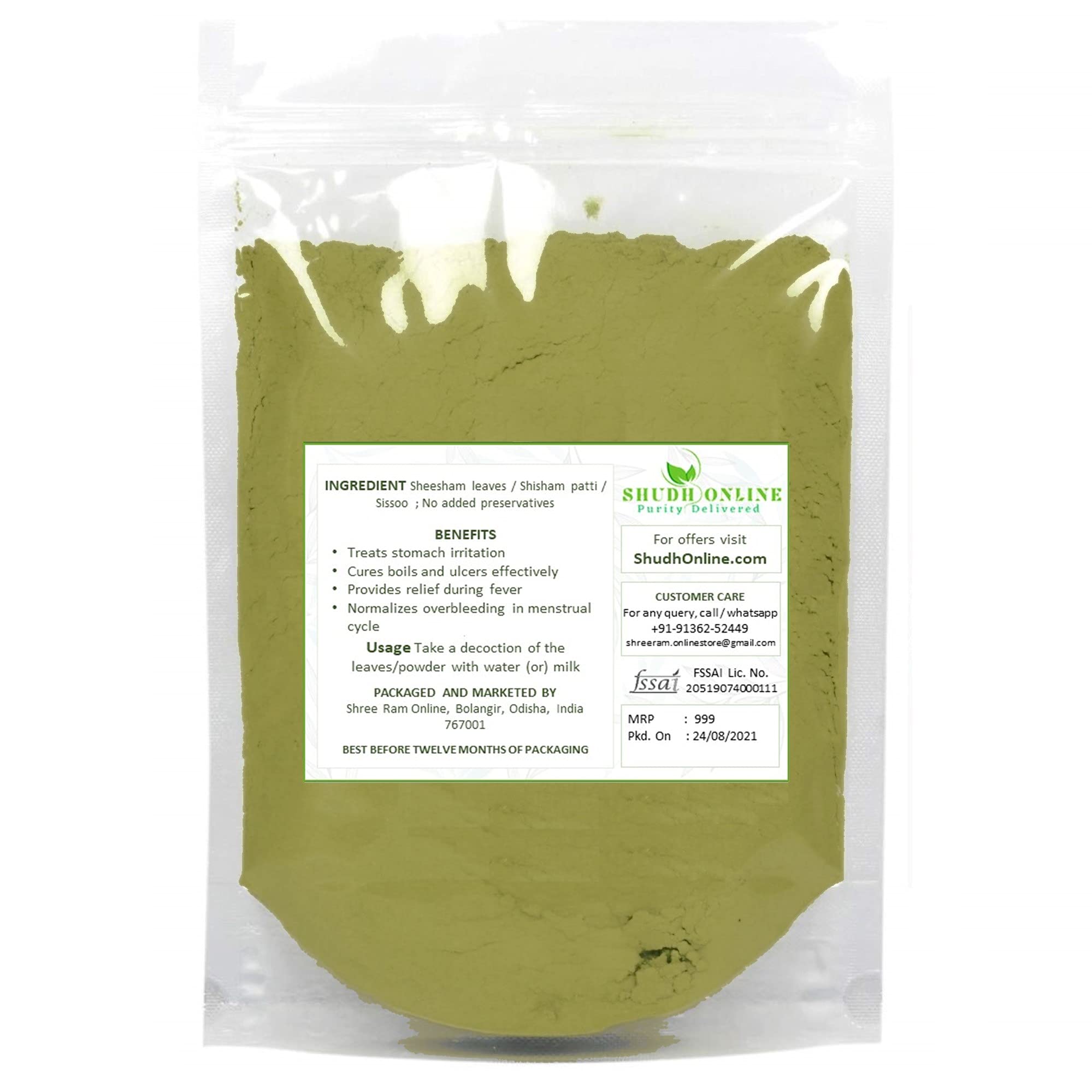 Shudh Online Sheesham leaves powder have a host of benefits as per ayurveda. In terms of size they have short petiolules and broad; nearly truncate bases that form a slight angle. Leaves are shiny and succulent when young and become thicker with age. It is also known as Aguru Shinshapa Shisu Shishu Sisu Bombay Blackwood Sissoo Indian Rosewood Sisso Agaru Biridi Tali Gette Kara Shisham Sisam Sissai Sissu Sissoo Sisuitti Sisso Nukkukattai Yette Gette Du-Khaek Pradu-Khaek. Shudh Online products are selectively sourced with great emphasis on purity and authenticity and are 100% natural ayurvedic products. We don't add any preservatives or additives in the product and using our product will get you closure to nature.