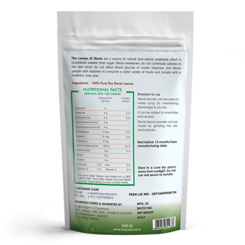 The leaves of Stevia are a source of natural zero-calorie sweetener which is considered sweeter than sugar. Stevia sweeteners do not contribute calories to the diet which do not affect blood glucose or insulin response and allows people with diabetes to consume a wider variety of foods and comply with a healthful meal plan. Direction to use: Stevia leaves can be used to make syrup for sweetening beverages & sauces. It can be added to smoothies and recipes. Stevia leaves powder can be made by grinding the dry stevia leaves.