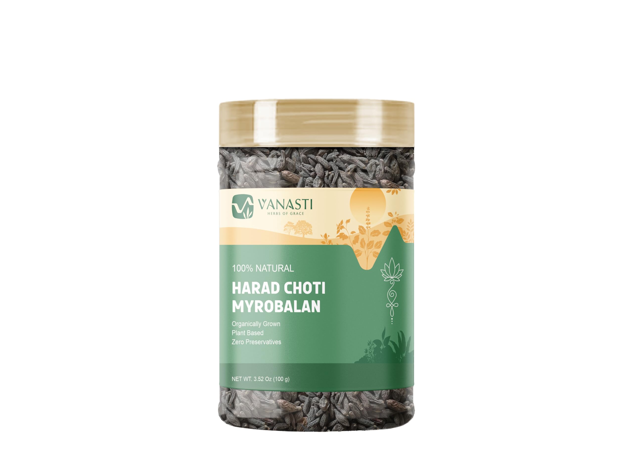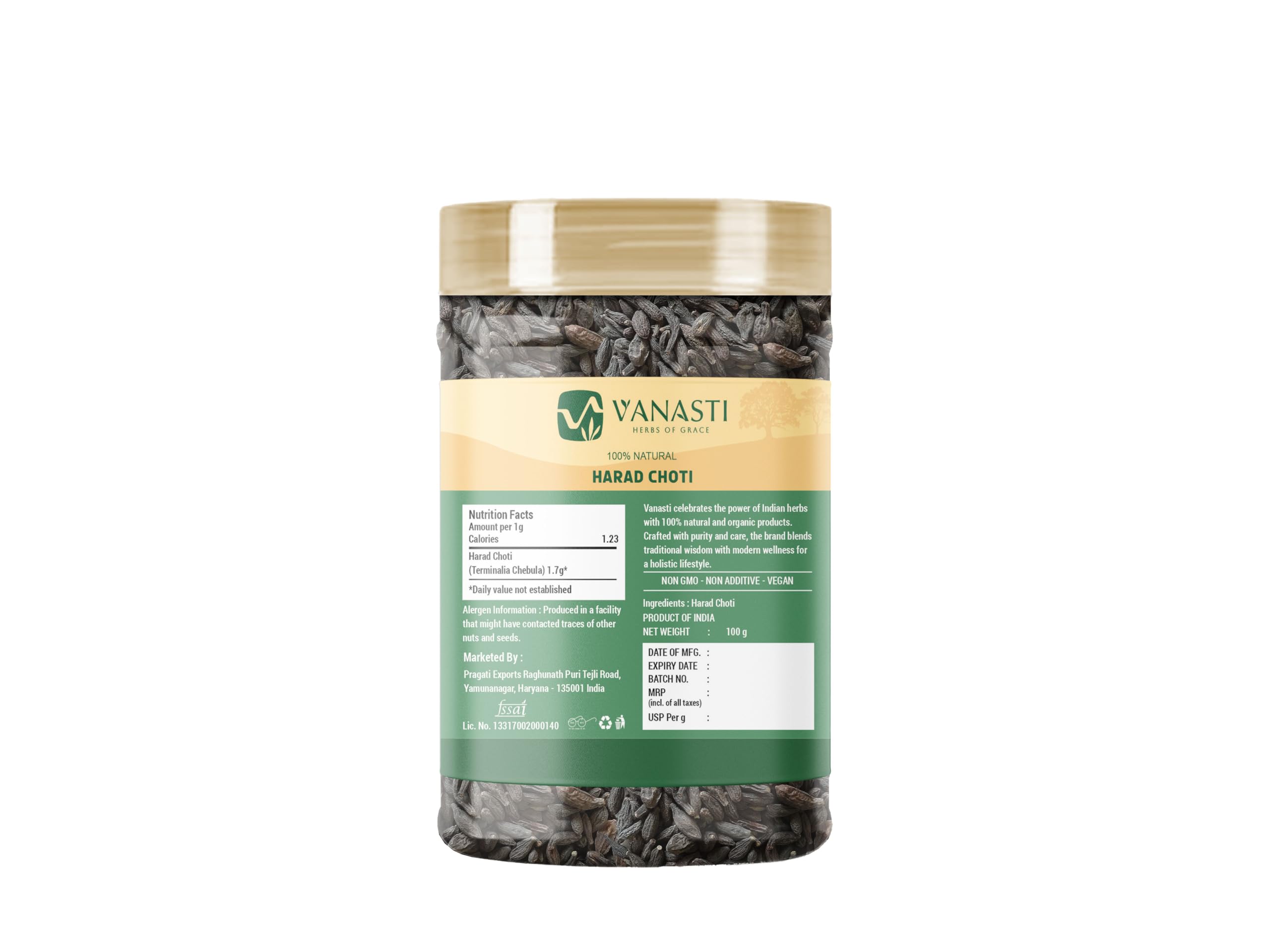 Harad Choti (also called Kali Harad or Black Himej) is the small, dried fruit of the Terminalia chebula tree, which grows in Southeast Asia. These fruits are dark brown to black in color, wrinkled in appearance, and have a slightly bitter taste. Harad Choti has been part of traditional practices for a long time and is often used in herbal powders and natural blends. It naturally contains vitamin C, iron, and plant compounds like tannins and flavonoids.