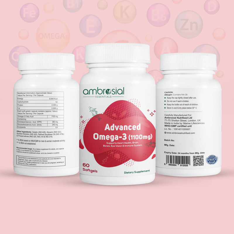 Ambrosial Advance:- Omega 3 Fish Oil 1100mg, EPA- 360mg, & DHA- 240mg per capsule