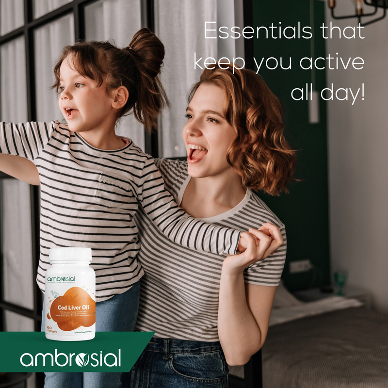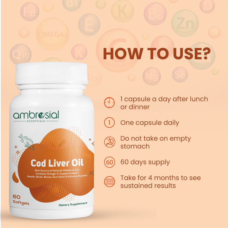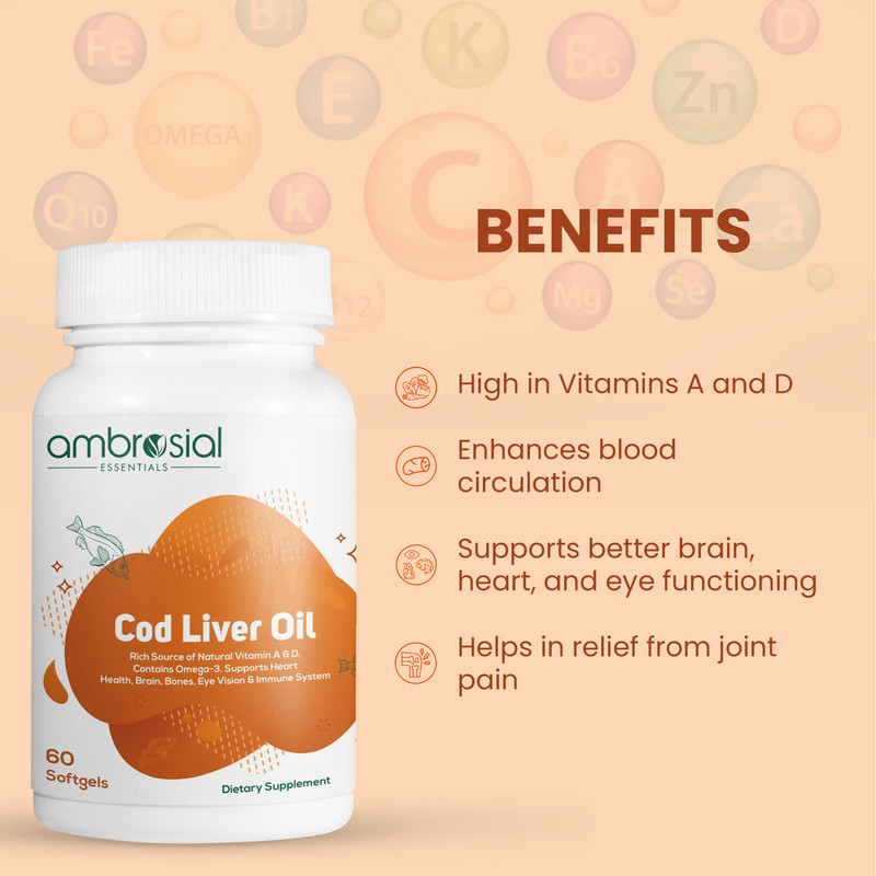 HEART HEALTH, JOINT, SKIN AND BRAIN Taking a quality cod liver oil like of Ambrosial every day has many health benefits and may reduce joint pain, heart disease risk and inflammation. It may provide strong support to the immune system due to natural vitamin A, D and Omega-3, including EPA and DHA.