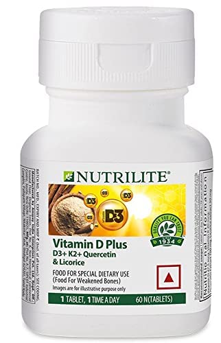 Each tablet of Nutrilite Vitamin D Plus contains 1900 IU of Vitamin D3. This is the safe and effective daily dose of Vitamin D to support the condition of weakened bones. Leading institutes like International Osteoporosis Foundation recommends 1500-2000 IU (37.5 â 50 ug) per day of supplemental Vitamin D to prevent fractures and bone loss. In addition Nutrilite Vitamin D Plus contains 20mcg of Vitamin K2 per tablet. Vitamin K2 Helps in directing calcium to the right places (bones) in the body so that calcium does not get deposited in the soft tissues (eg: Blood vessels). It also help to maintain healthy bone structure and promote bone mineralization. Thirdly Nutrilite Vitamin D Plus contains an exclusive patented blend of licorice and quercetin. This combination helps to support bone health. Product comes with no artificial colors flavors or preservatives. Nutrilite Vitamin D Plus is a plus product with Vitamin D3 K2 licorice quercetin as a daily supplement for the adults with weakened bones.