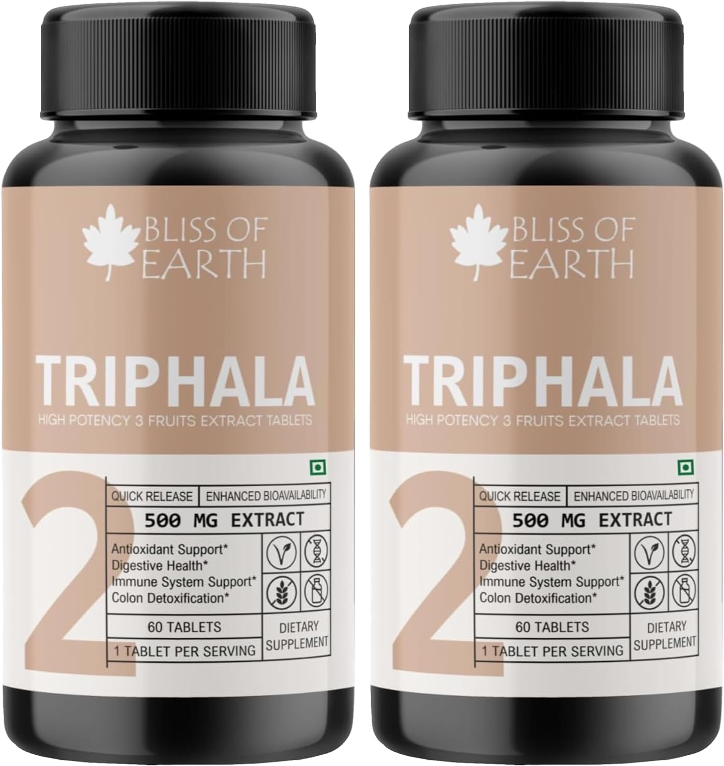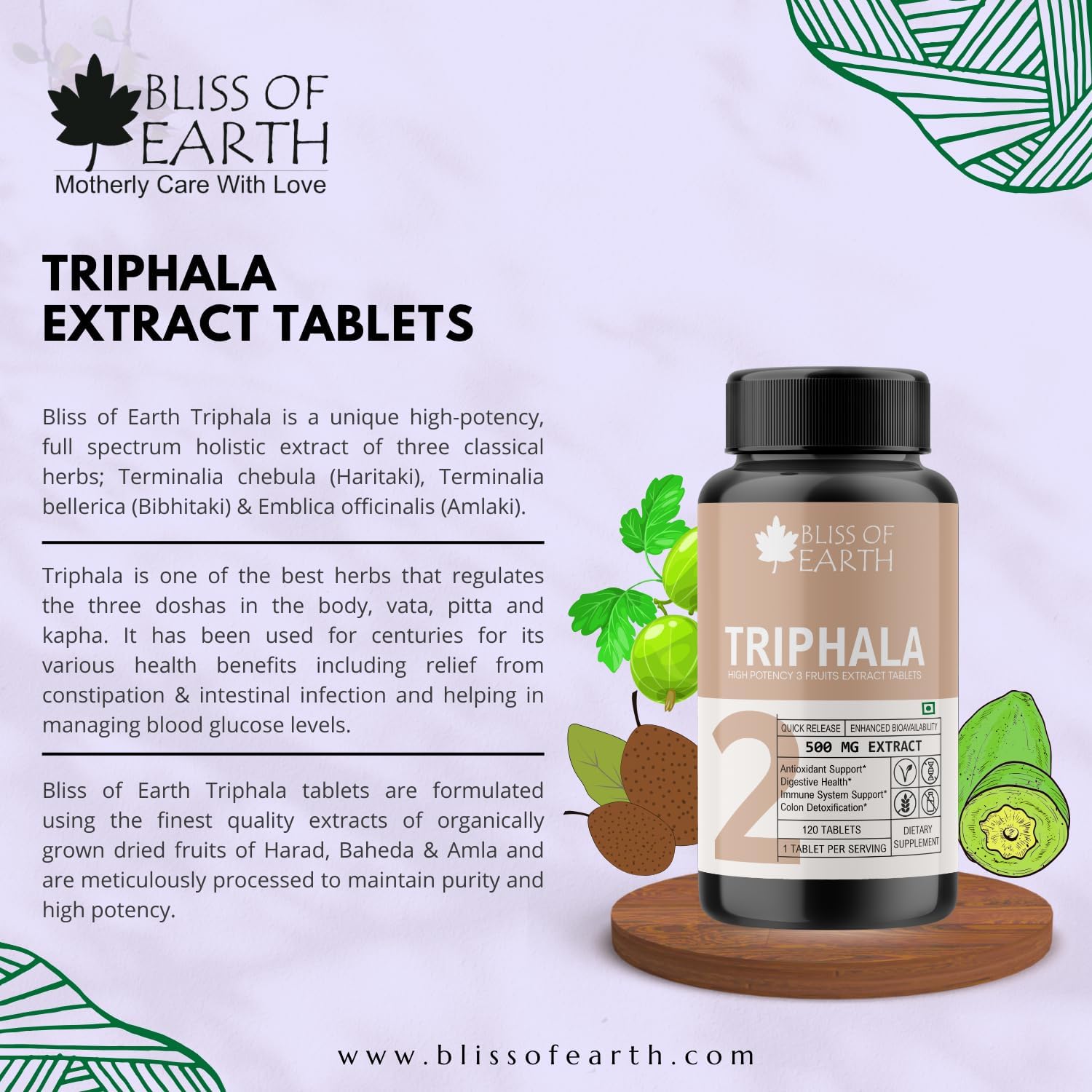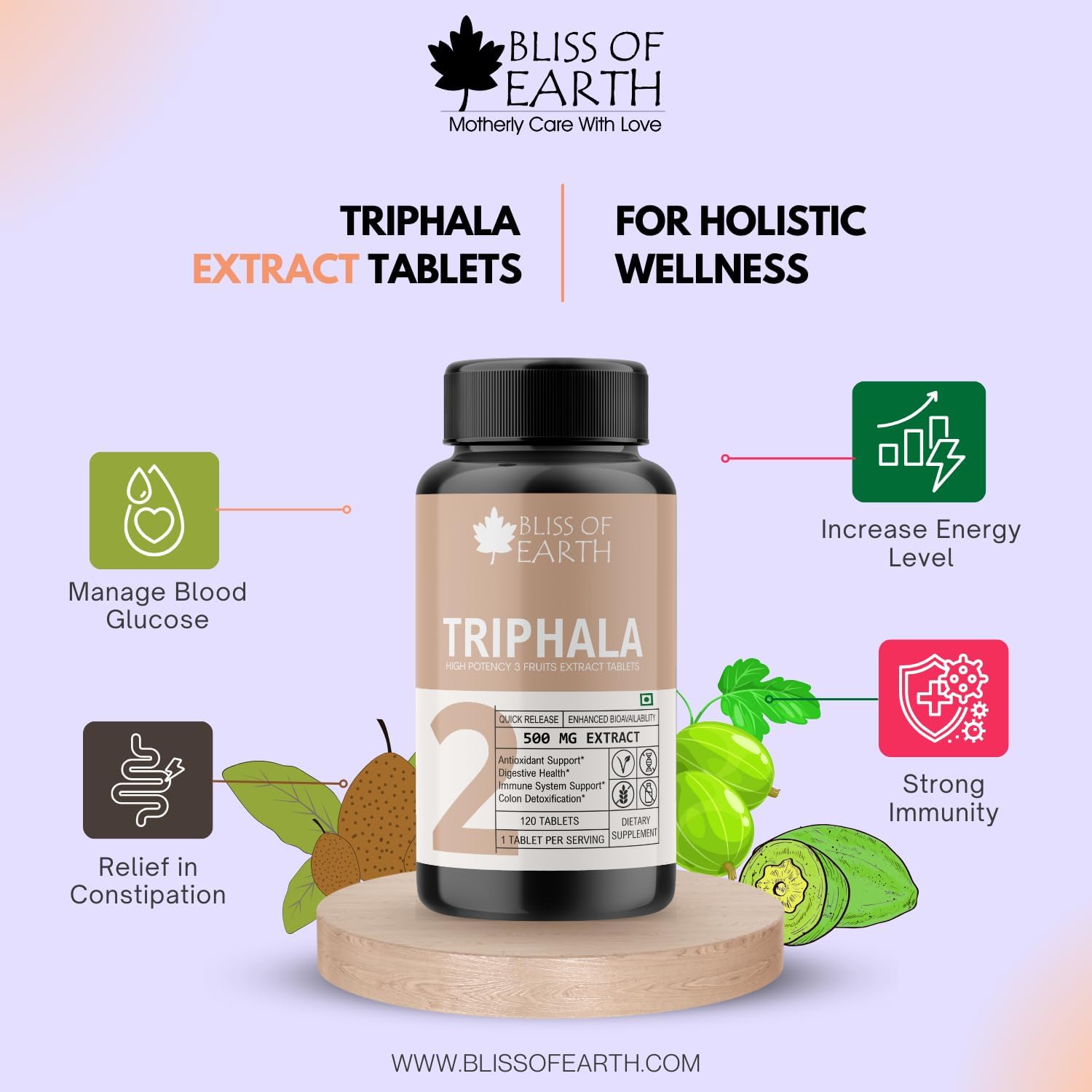 Discover the time-honored secret of Triphala with Bliss of Earth Triphala Extract Tablets. Triphala a blend of three powerful Ayurvedic fruits - Amla (Indian Gooseberry) Haritaki (Terminalia chebula) and Bibhitaki (Terminalia bellirica) has been cherished for centuries for its digestive health benefits. These 500mg tablets offer a convenient and effective way to support your digestive system and alleviate constipation.