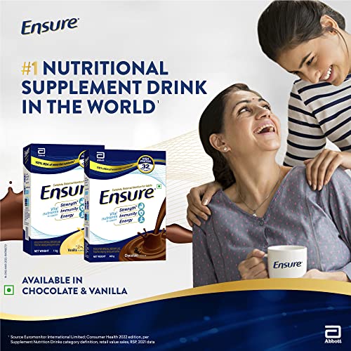 Ensure is a complete balanced nutrition supplement for adults. It has the perfect blend of 32 vital nutrients. It is scientifically designed for adults to help them keep strong healthy and support recovery. It contains high-quality proteins that help improve muscle strength & a balanced macronutrient ratio that supports optimum utilization of proteins. This product is scientifically formulated and clinically shown with 32 nutrients including protein calcium Vitamin D that could be missing from your diet. This specialized nutritional drink is available in chocolate and vanilla flavour and comes in 200gm 400gm 1kg and 2kg sizes.