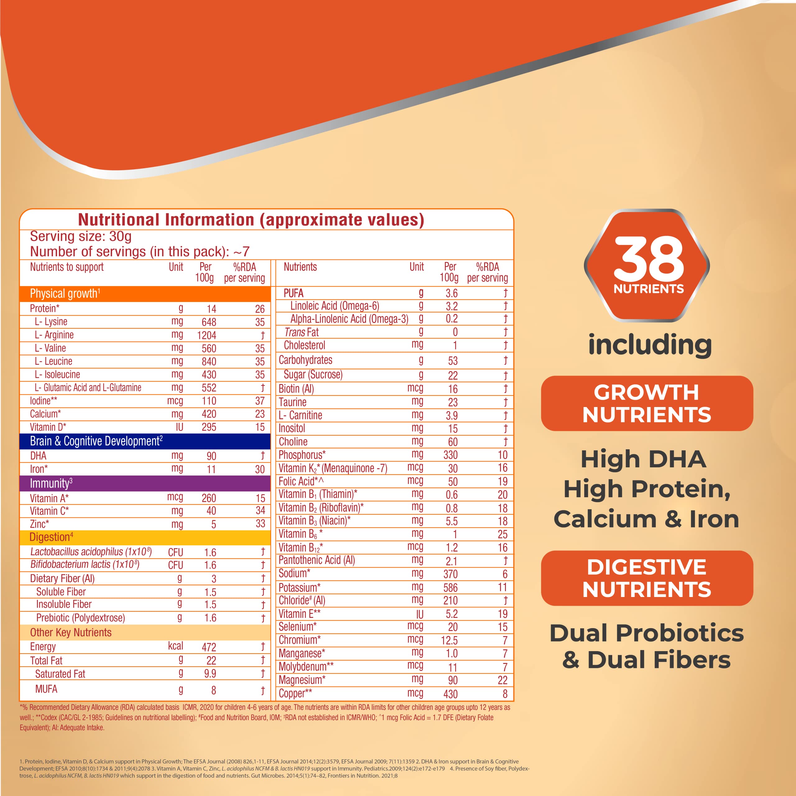 High quality protein (PDCAAS 1) - Soy protein isolate (SUPRO) and Milk protein with amino acids which are building blocks of protein for growth in children.