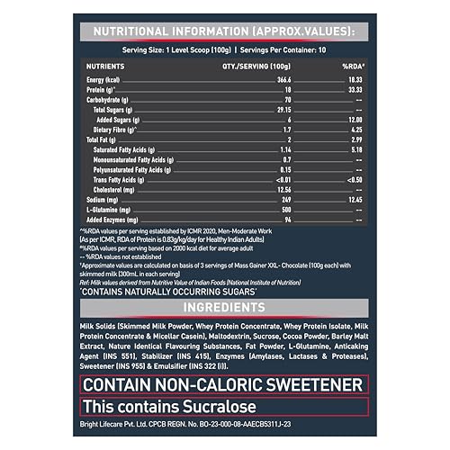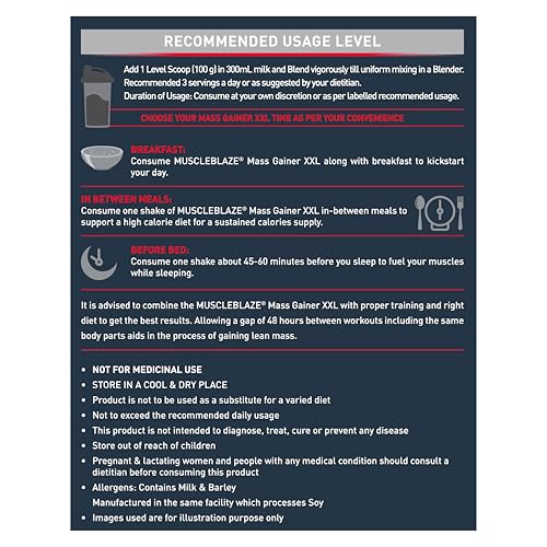 • HIGH CALORIE GAINING FORMULA: MuscleBlaze Mass Gainer XXL is a potent supplement that when used in conjunction with training helps gym-goers bulk up. It is a high calorie-gaining formula which offers a sizable 1361 kcal and 76.5 g protein from three servi