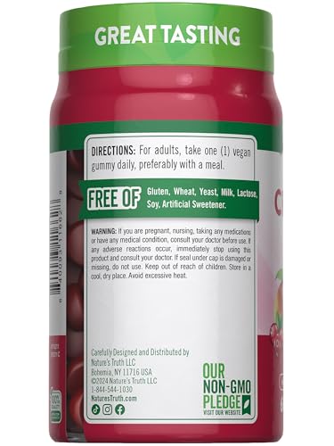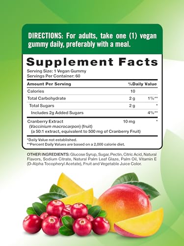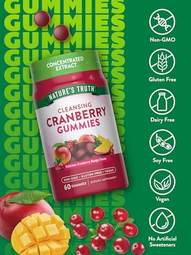 Enjoy a daily dose of cleansing Cranberry Gummies from Natures Truth! These delicious gummies have a natural cranberry mango flavor and are a pleasure to take. Each gummy serving provides the equivalent of 25000 mg of cranberry per serving.Our cleansing Cranberry Gummies are vegan friendly and deliver 500 mg of a 50:1 concentrate per serving of the cranberry fruit Vaccinium macrocarpon. Each great-tasting gummy serving delivers a high-quality source of cranberry extract to support your needs.At Natures Truth we know how important a trusted wellness experience is for you and the ones you love. Thats why we only use the very best ingredients in our cleansing Cranberry Gummies. These vegan gummies are non-GMO and free of gluten wheat yeast milk lactose and soy. They were created without any artificial colors artificial flavors or artificial sweeteners. You can always expect pure and honest nutrition from Natures Truth.