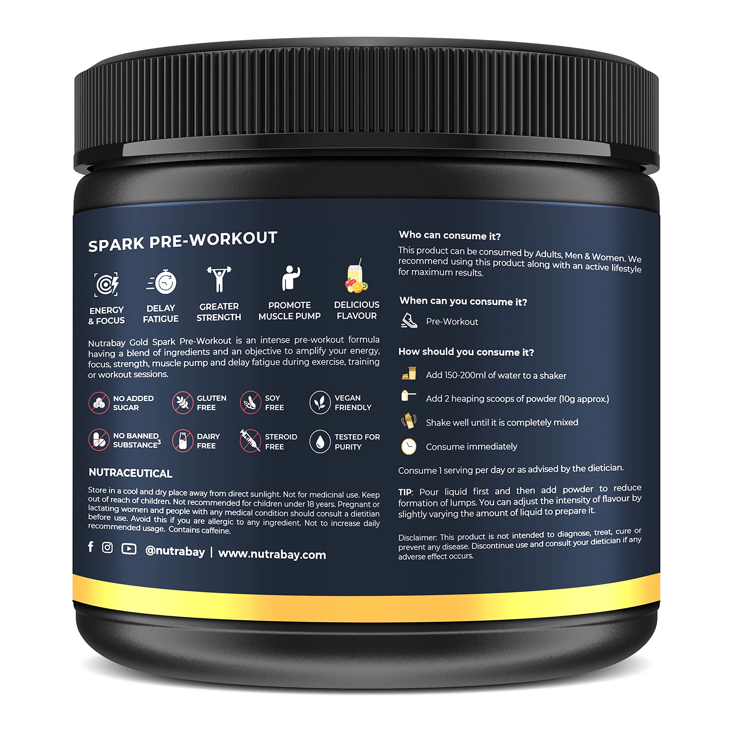 Nutrabay Gold Whey Protein Isolate - Strawberry Milkshake 1kgNutrabay Gold Whey Protein Isolate is designed to give you a rich protein source for building muscle and faster recovery. It is complemented with an enzyme blend for improved digestion higher and faster protein absorption. We use one of the highest quality ingredients available in the market to ensure that you get the best results. Our unique highly researched and best in class flavours get you a delicious whey protein shake that you would love drinking every time.Nutrabay Gold Spark Pre-Workout - Fruit Punch 300gNutrabay Gold Spark Pre-Workout is an intense pre-workout formula having a blend of ingredients and an objective to amplify your energy focus strength muscle pump and delay fatigue during exercise training or workout sessions.