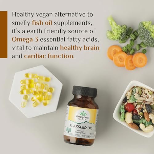 RGANIC INDIA Flaxseed Oil 60 Capsules for Omega-3 & Heart Health Rich in Omega-3 helps reduce high cholesterol plays a role in burning body fat and supports healthy skin & nails.