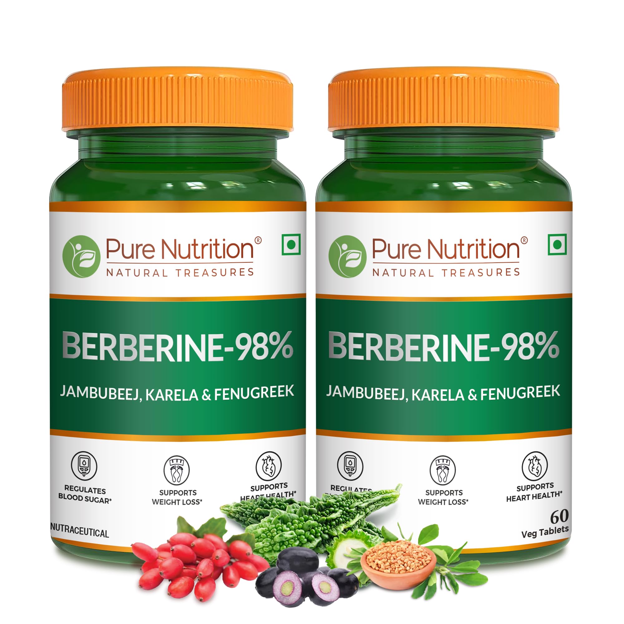 Pure Nutrition BERBERINE 98% supplement integrates high-potency berberine extract with Jamun Karela and Fenugreek extracts. This blend is crafted to help in weight management by supporting metabolism. Additionally the supplement promotes heart health with berberine recognized for its cardiovascular benefits. Each vegetarian tablet ensures convenience and quality offering a holistic approach to wellness through natural ingredients known for their beneficial properties.