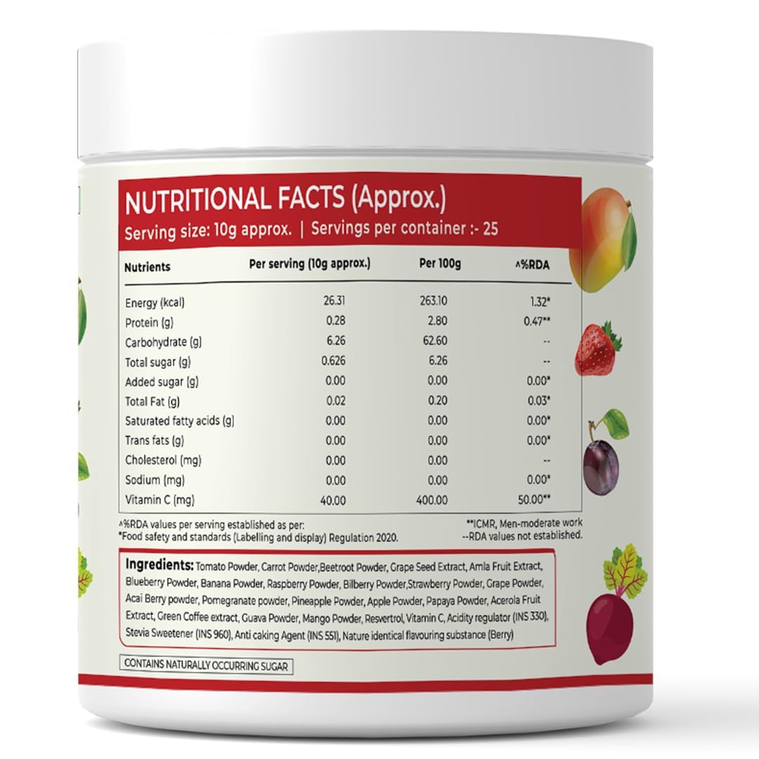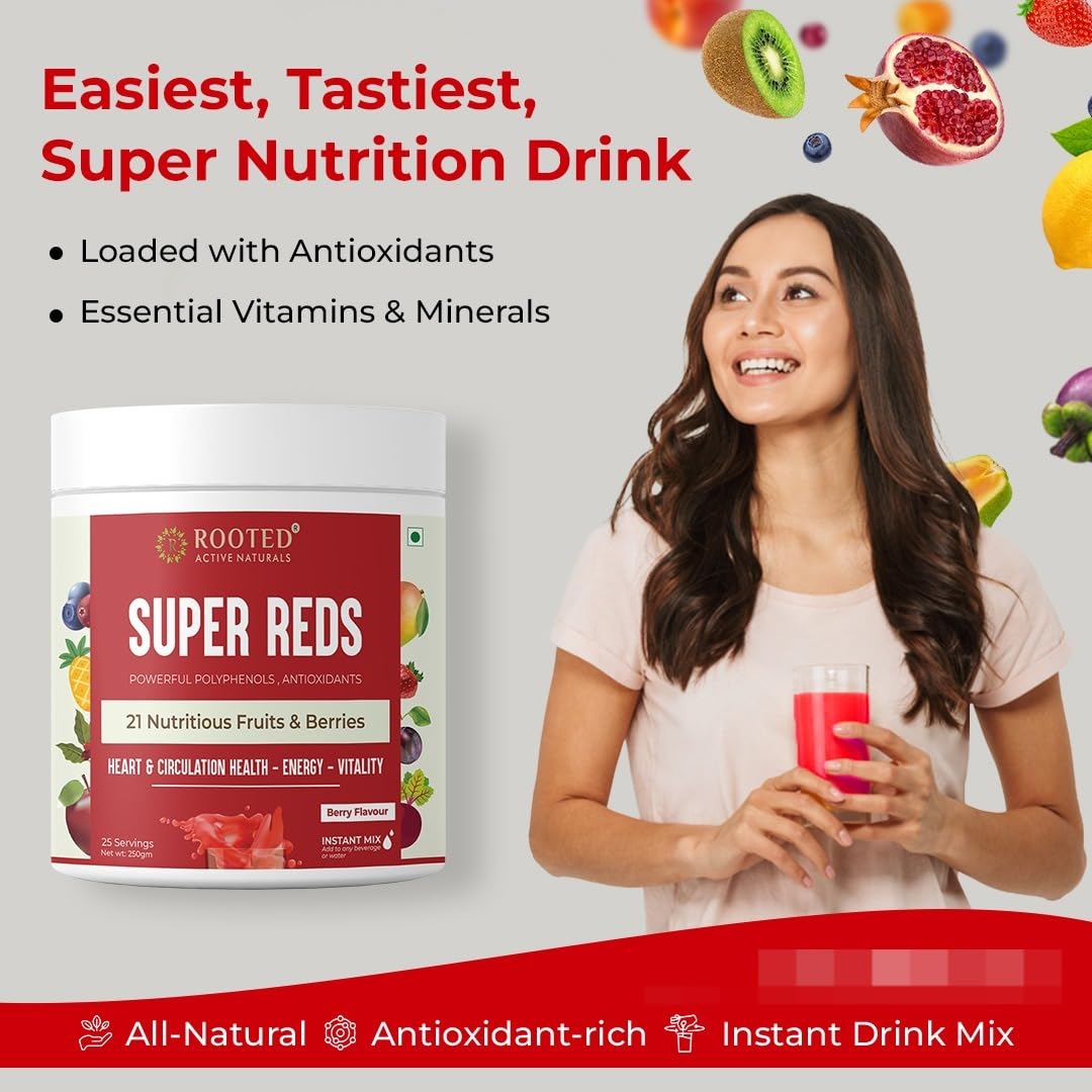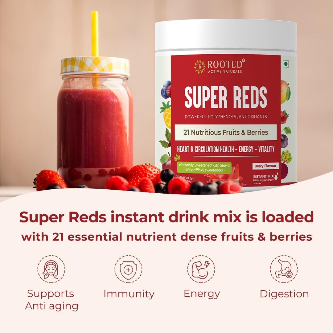 Rooted Actives Super Reds Powder (Pack of 3 250g each) is a flavorful blend of 21 nutrient-packed superfruits and berries including grapes raspberries beetroot strawberries acai berry pomegranate apple papaya and pineapple. This vegan non-GMO and gluten-free powder contains no artificial additives or added sugar making it an ideal addition to your daily nutrition routine. Enjoy the naturally delicious berry flavor by mixing it into water smoothies or shakes.