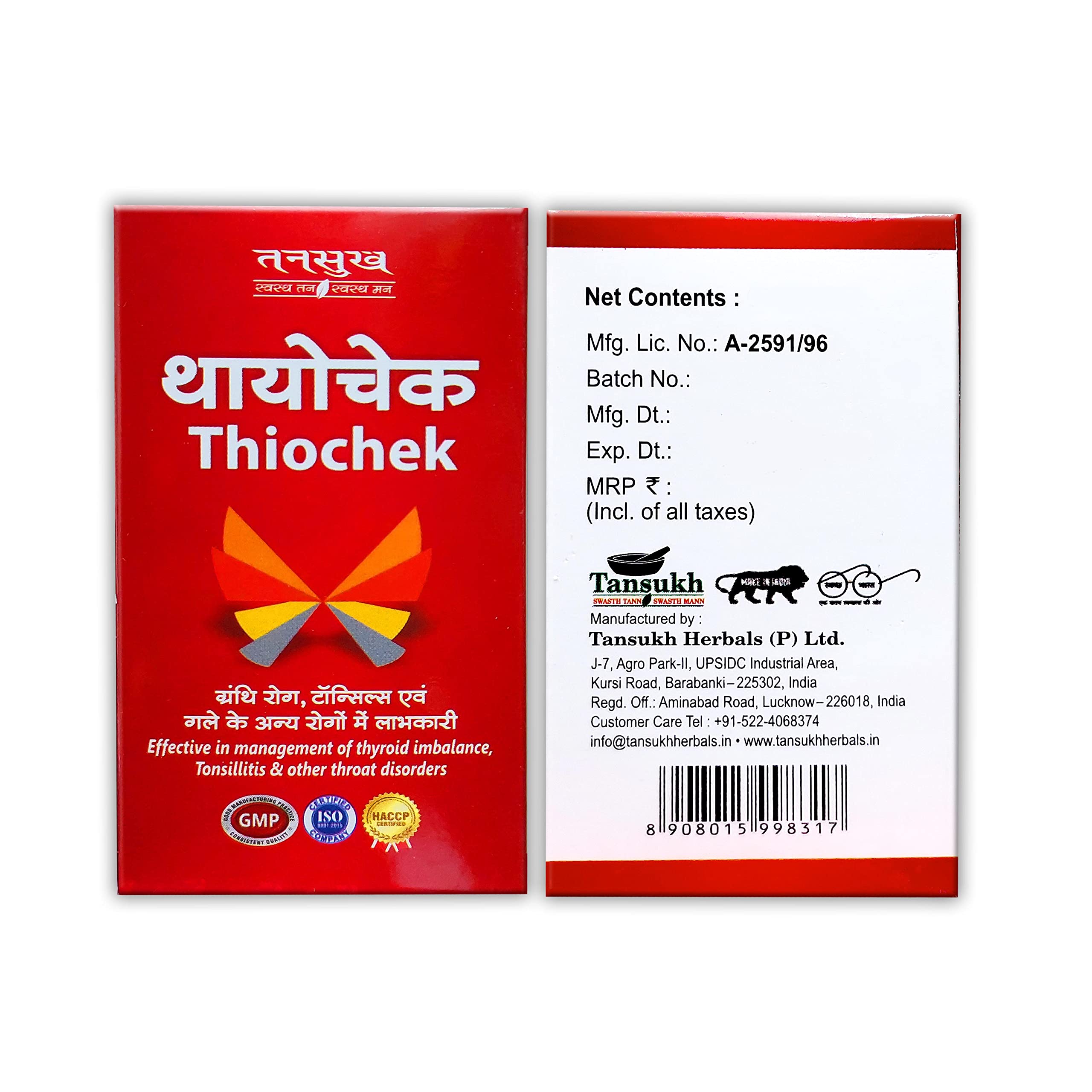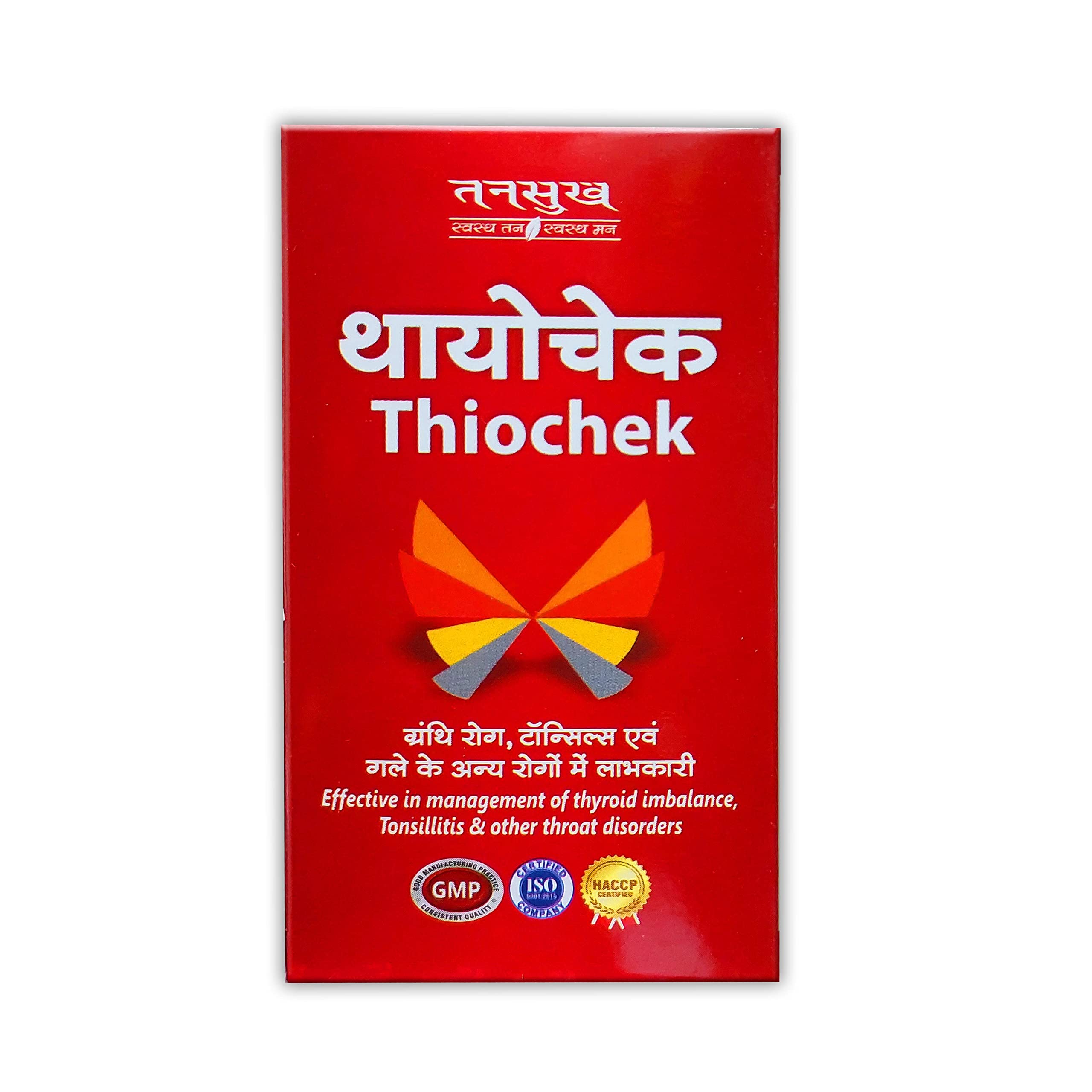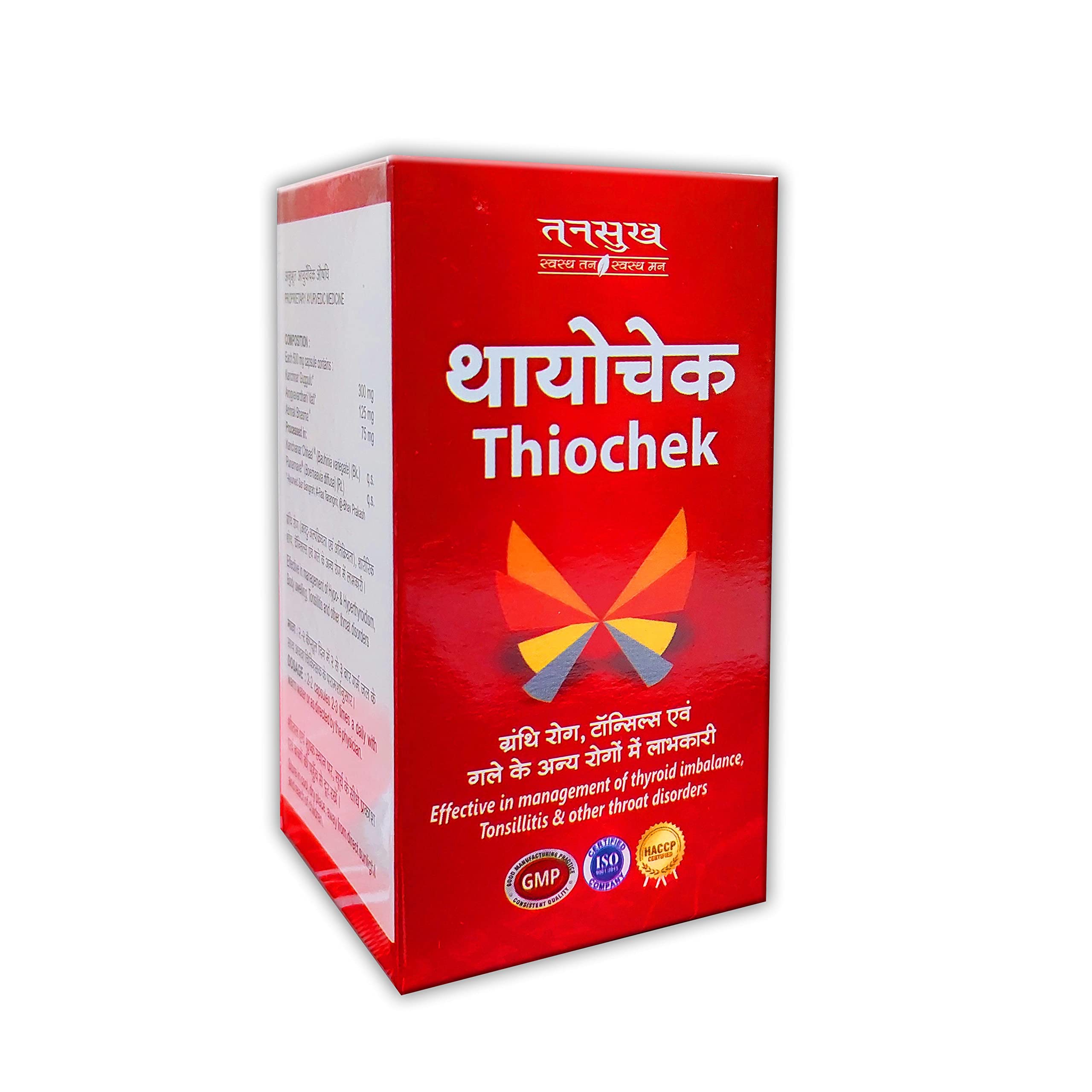 Tansukh Thiochek Capsule is complete ayurvedic combination that contains Kanchanar Guggulu Arogyavardhini Vati Abhrak Bhasma processed with Punarnava and Kanchanar Chhal. these combination of Guggulu and Vati Help naturally manage Throat Problems such as Thyroid.