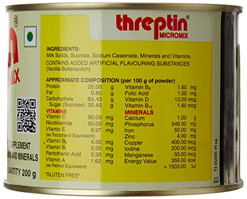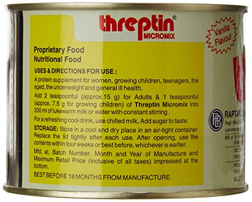 Directions for use: Add 2 spoonful (approx 15g) for adults and 1 teaspoonful (approx7.5g) for growing children of Threptin Micromix into 200ml of lukewarm milk or water with constant stirring. Pack Available: 200 gm Flavours Available: Vanilla. Chocolate. Threptin Micromix is the protein power for energy and health. Threptin Micromix contains 11 vitamins and 7 minerals that support the wellness of all age – groups like growing children pregnant or lactating women people with stressful life the aged and recuperating patients. Threptin Micromix is a complete protein of high biological value. Threptin Micromix is class 1 casein protein with highest PDCAAS (Protein Digestibility Corrected Amino Acid Score) value-1. Threptin Micromix is available in vanilla and chocolate flavours. Threptin Micromix the healthy and tasty protein supplement for all.